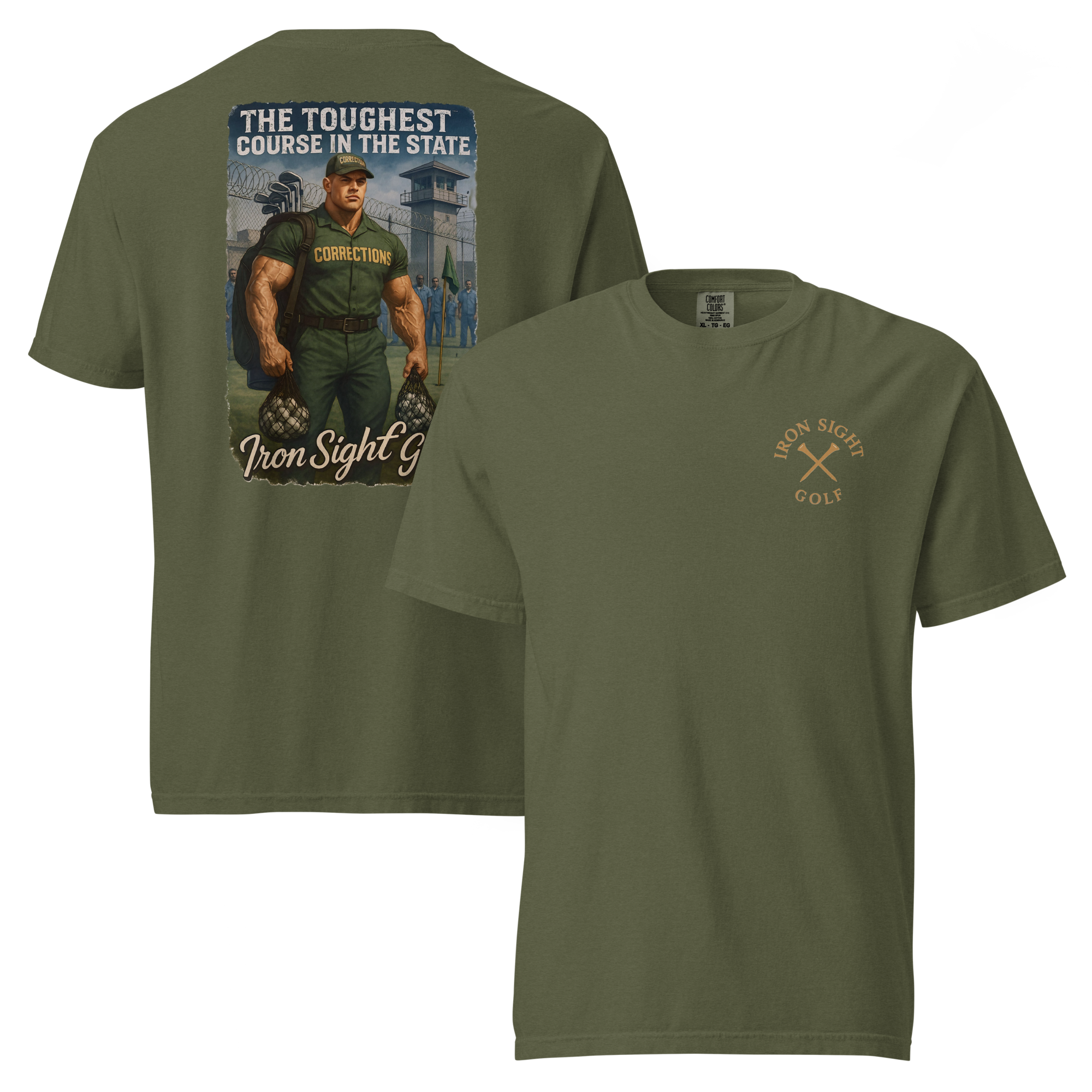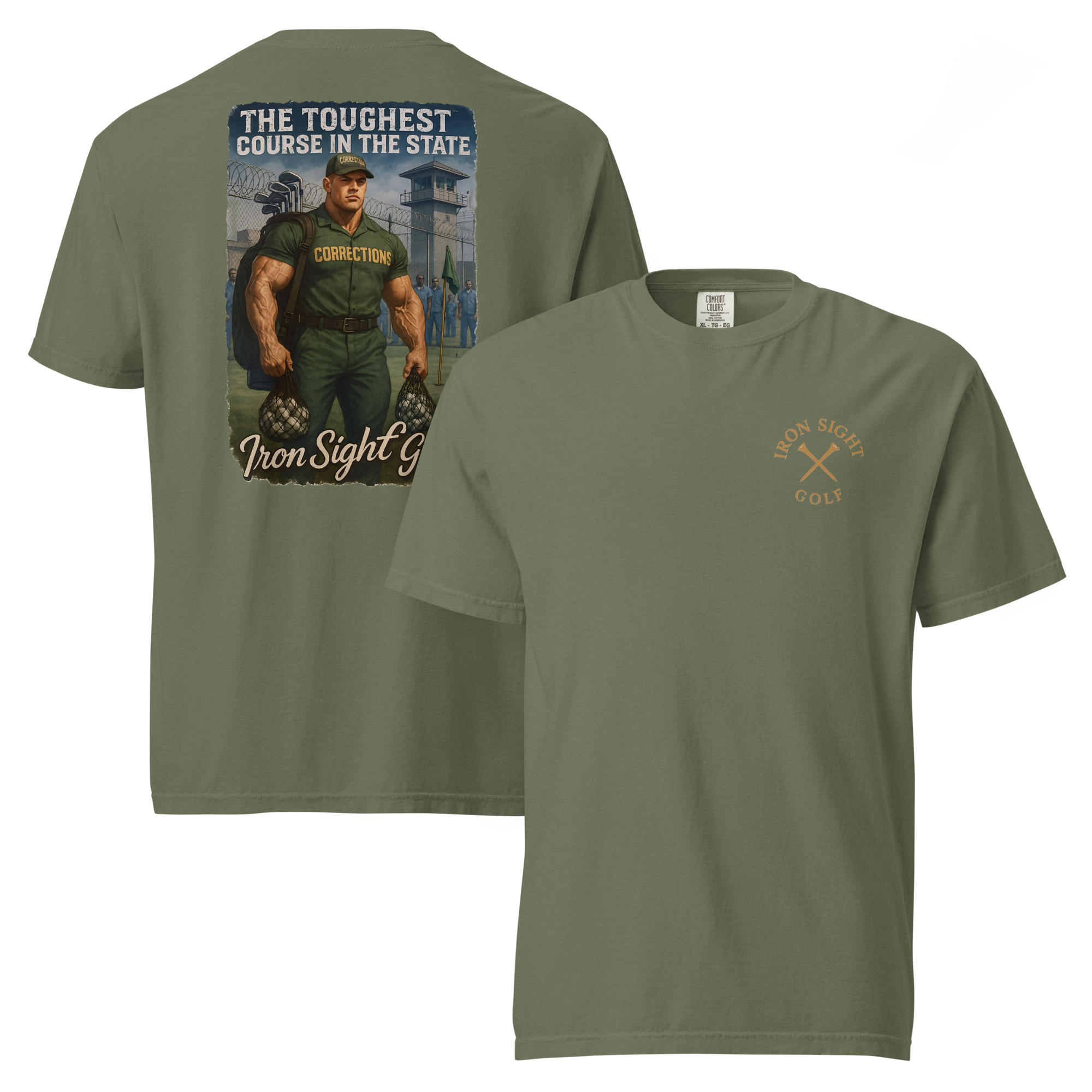 This bold graphic tee captures a scene like no other — a muscular corrections officer stepping onto the prison yard, golf bag slung and balls in hand, ready to take a swing on what’s often called the toughest beat in the state. The design blends grit and humor, making it a standout piece for golfers, first responders, and anyone who knows toughness when they see it.