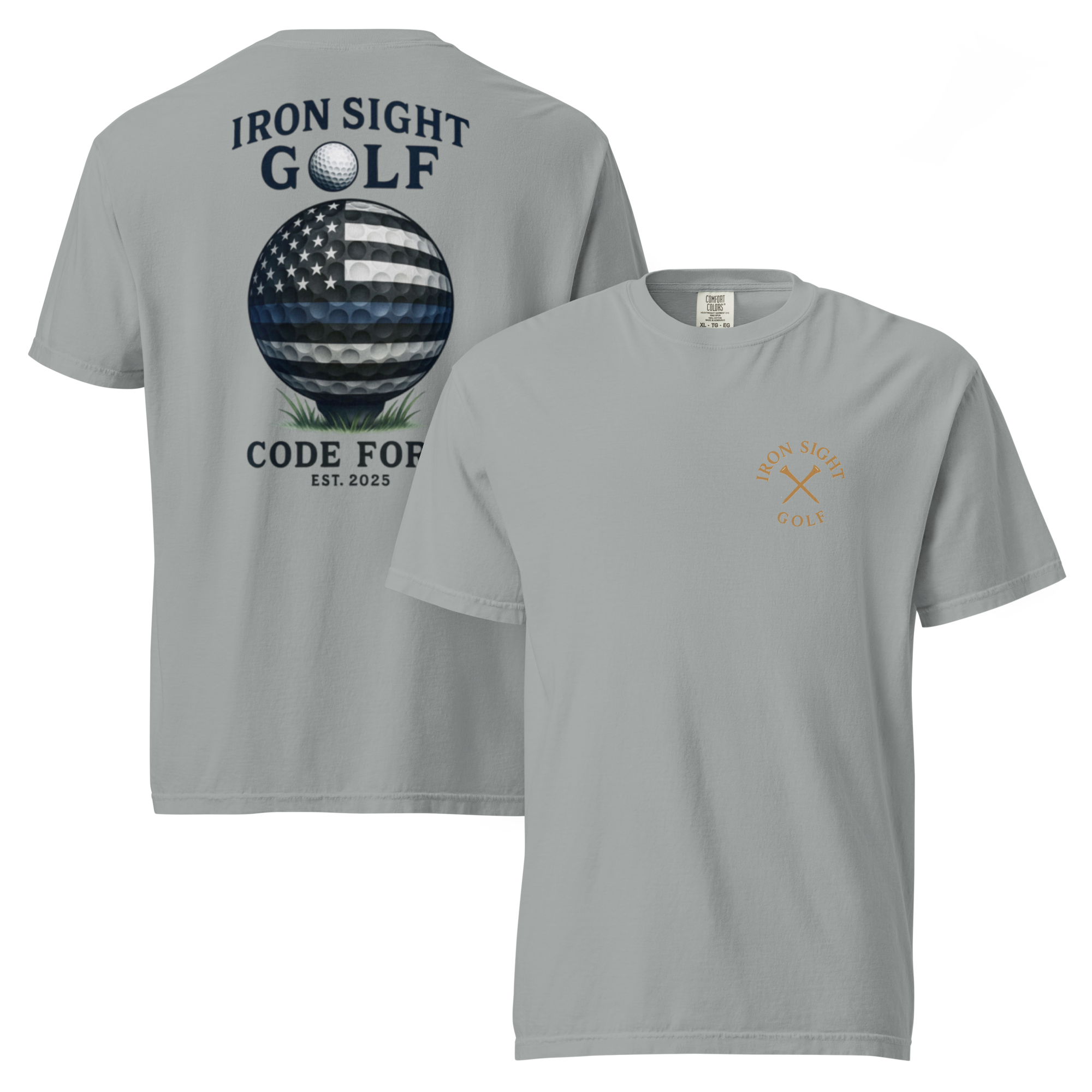 Blending law enforcement pride with the language of the game, the Iron Sight Golf “Code Fore” tee delivers a clever nod to both worlds. “Code Four” signals that everything is under control in police terms, while “Fore” warns golfers to watch out for an incoming ball. Featuring a bold, high-definition thin blue line golf ball design alongside the phrase “Code Fore,” this shirt honors first responders while speaking the universal language of golf. Built with durable fabric and a structured fit, it offers all-day comfort and a confident look.