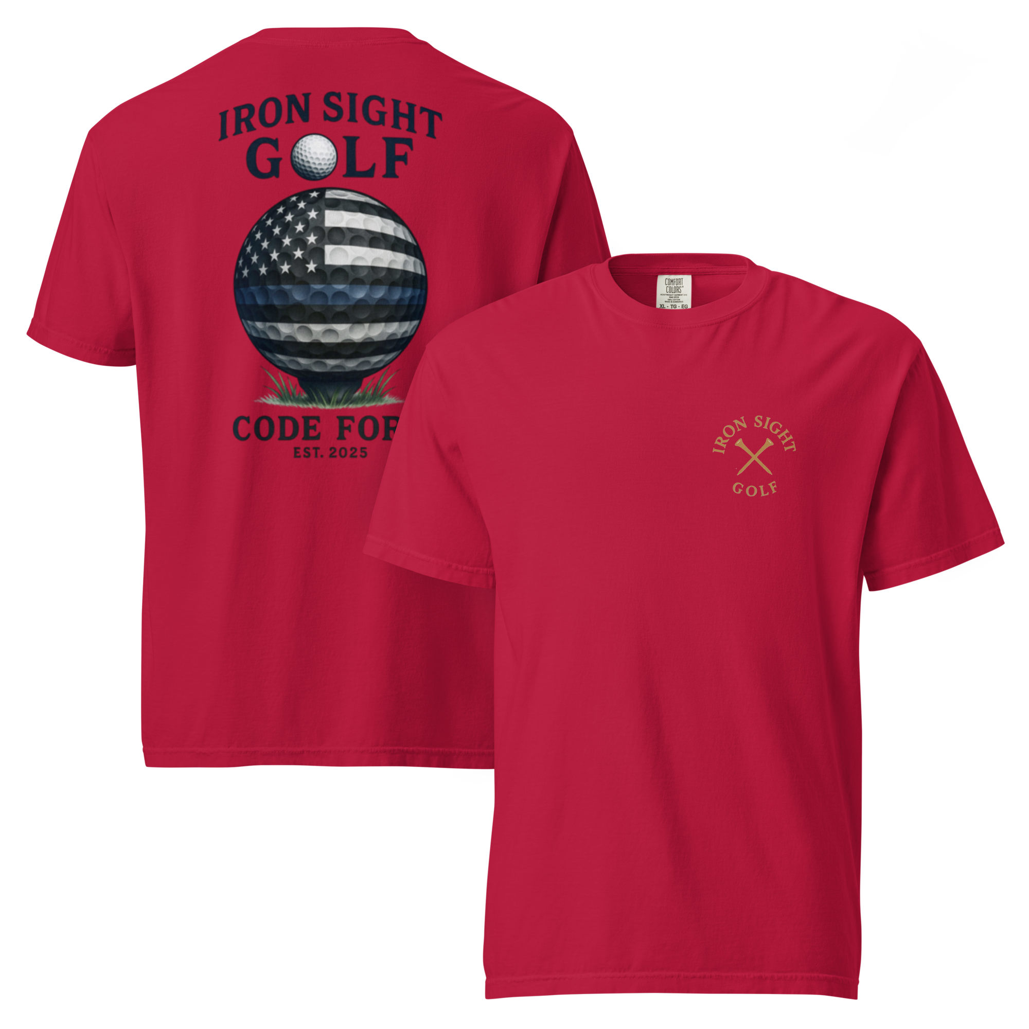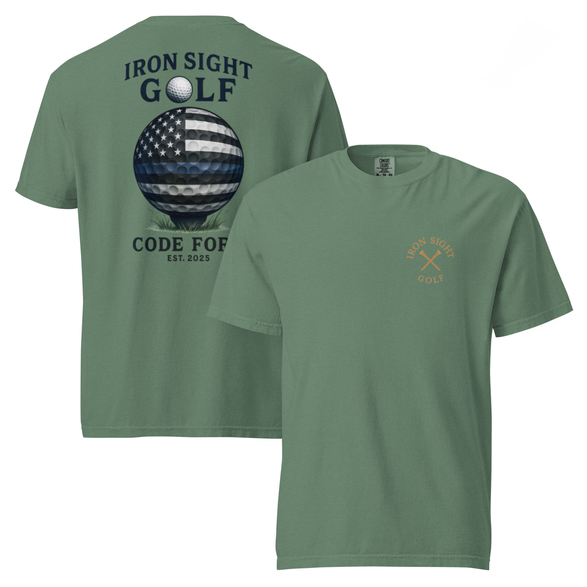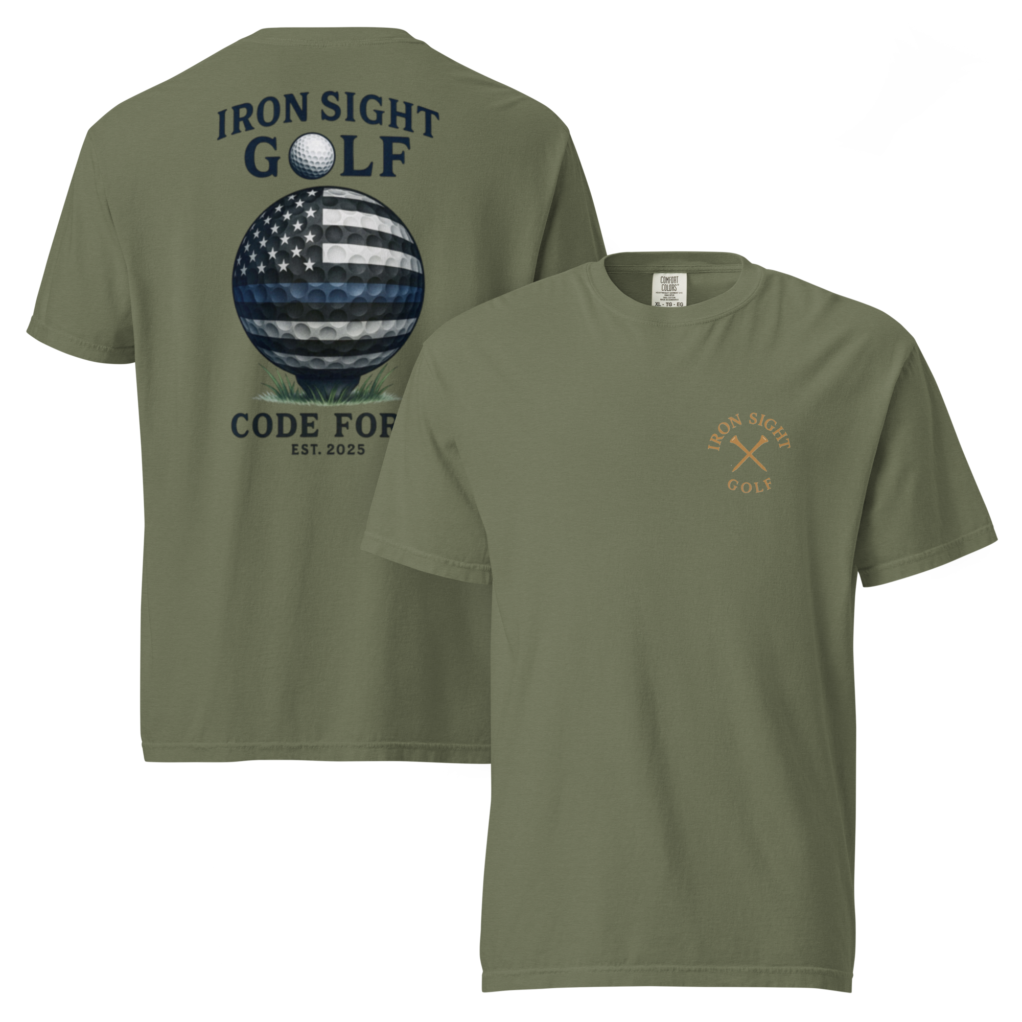 From the fairway to the beat, stay calm, stay ready, and play with pride in the Iron Sight Golf – Code Fore tee.