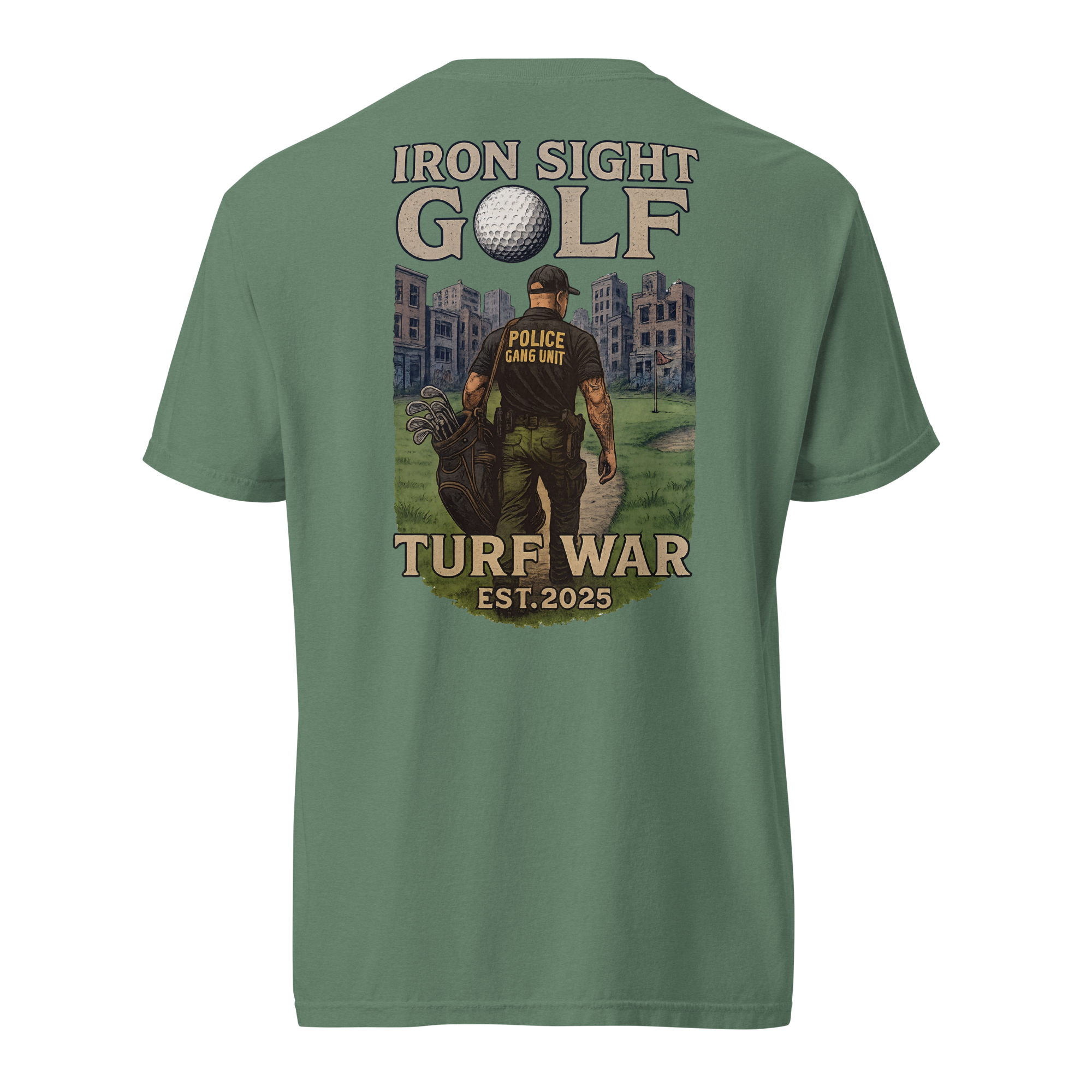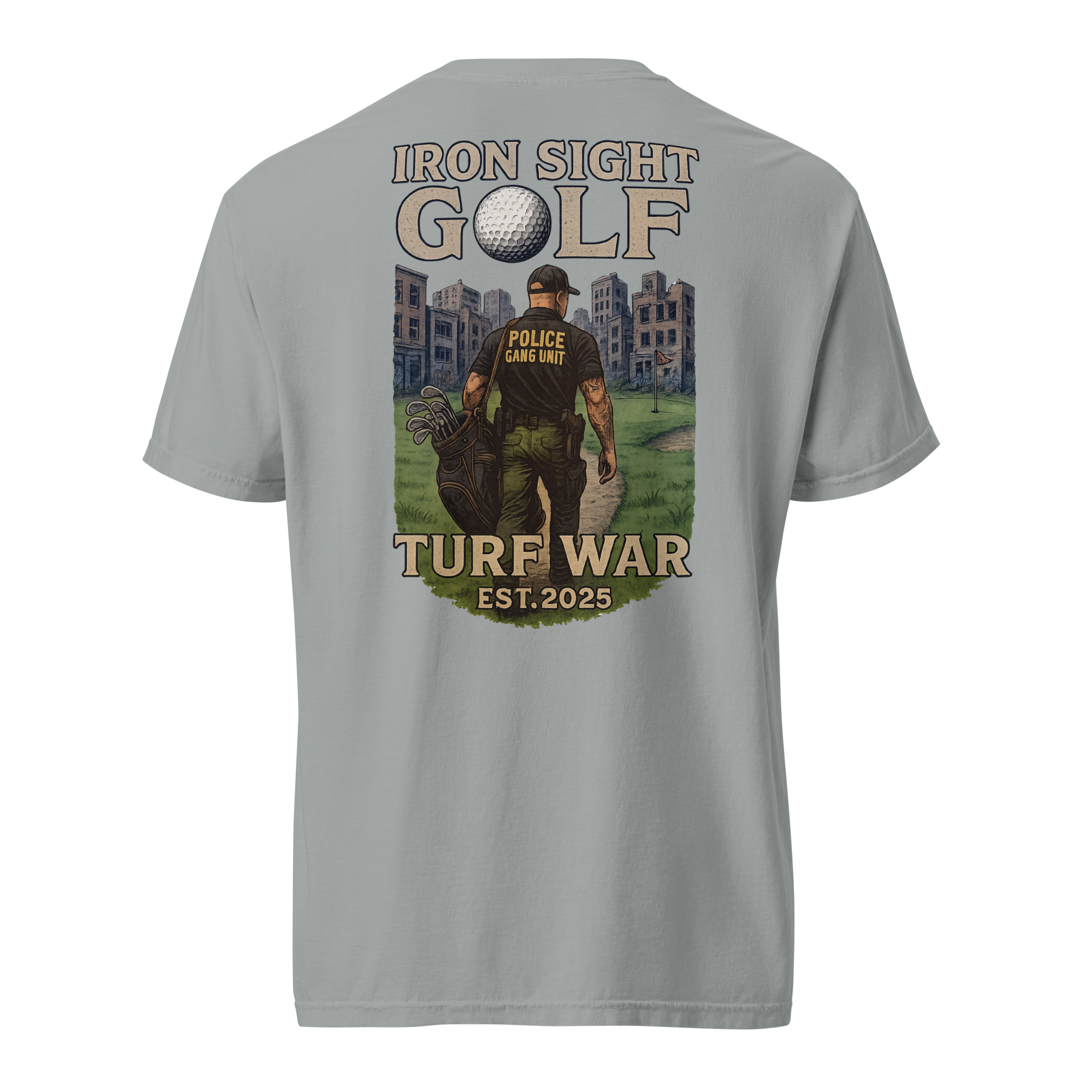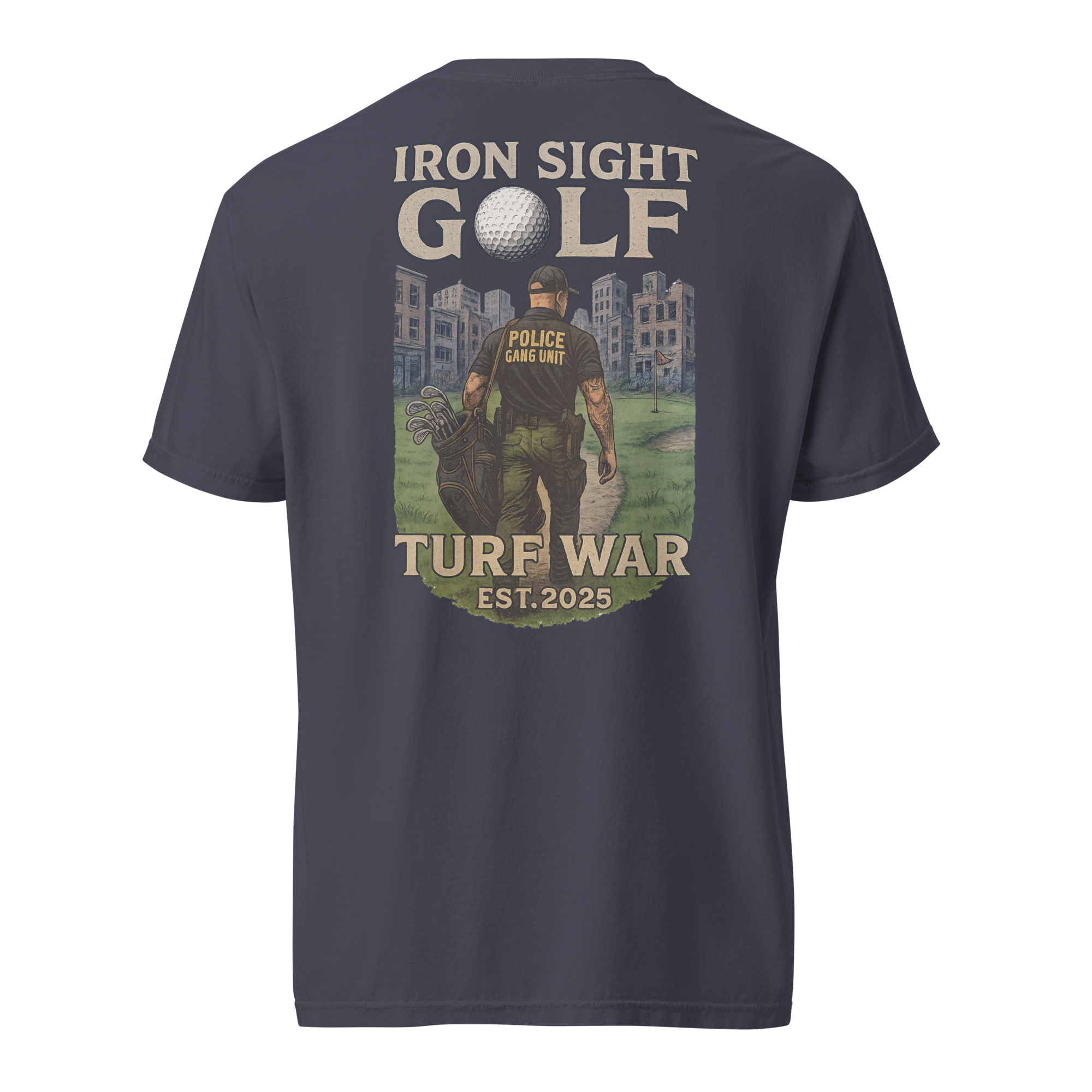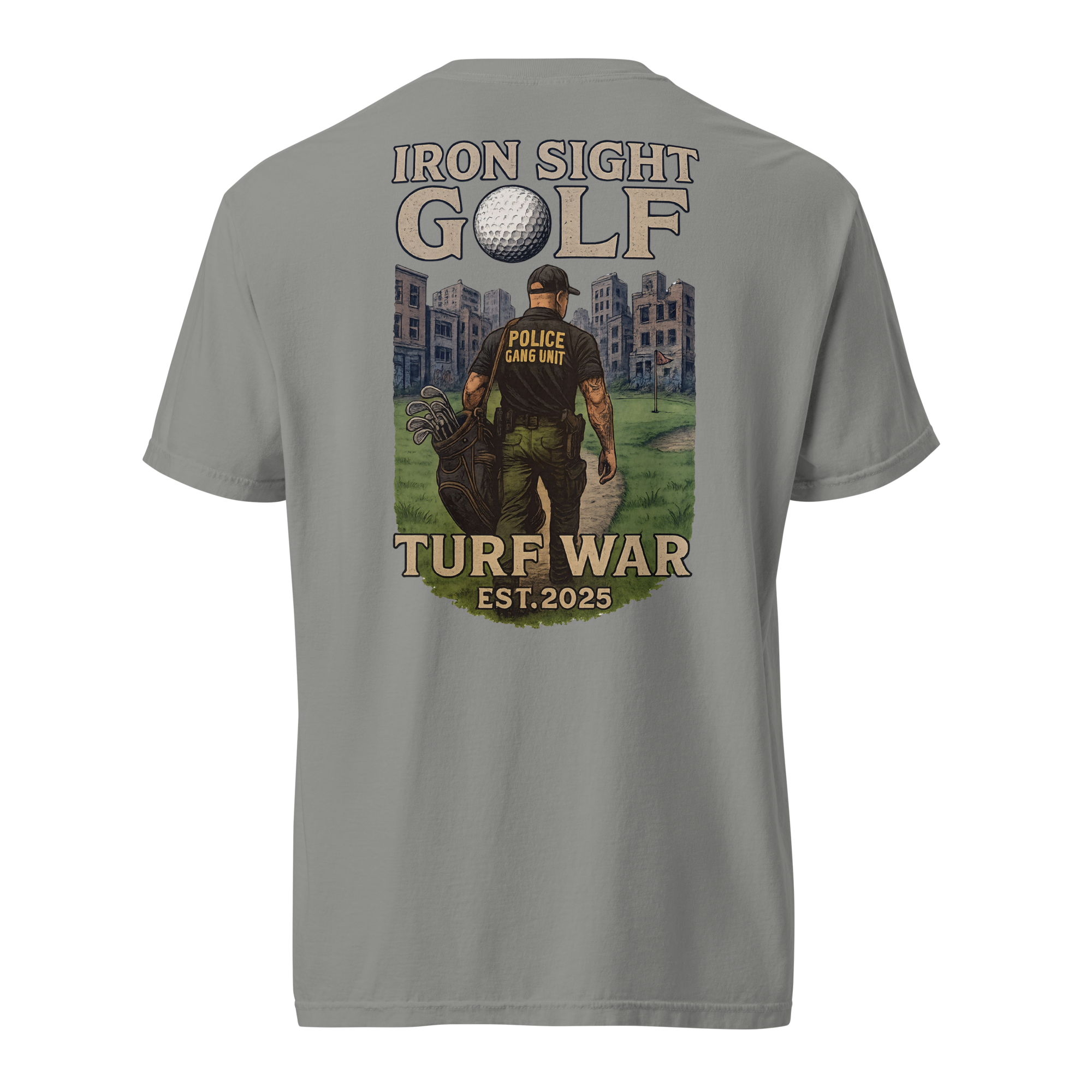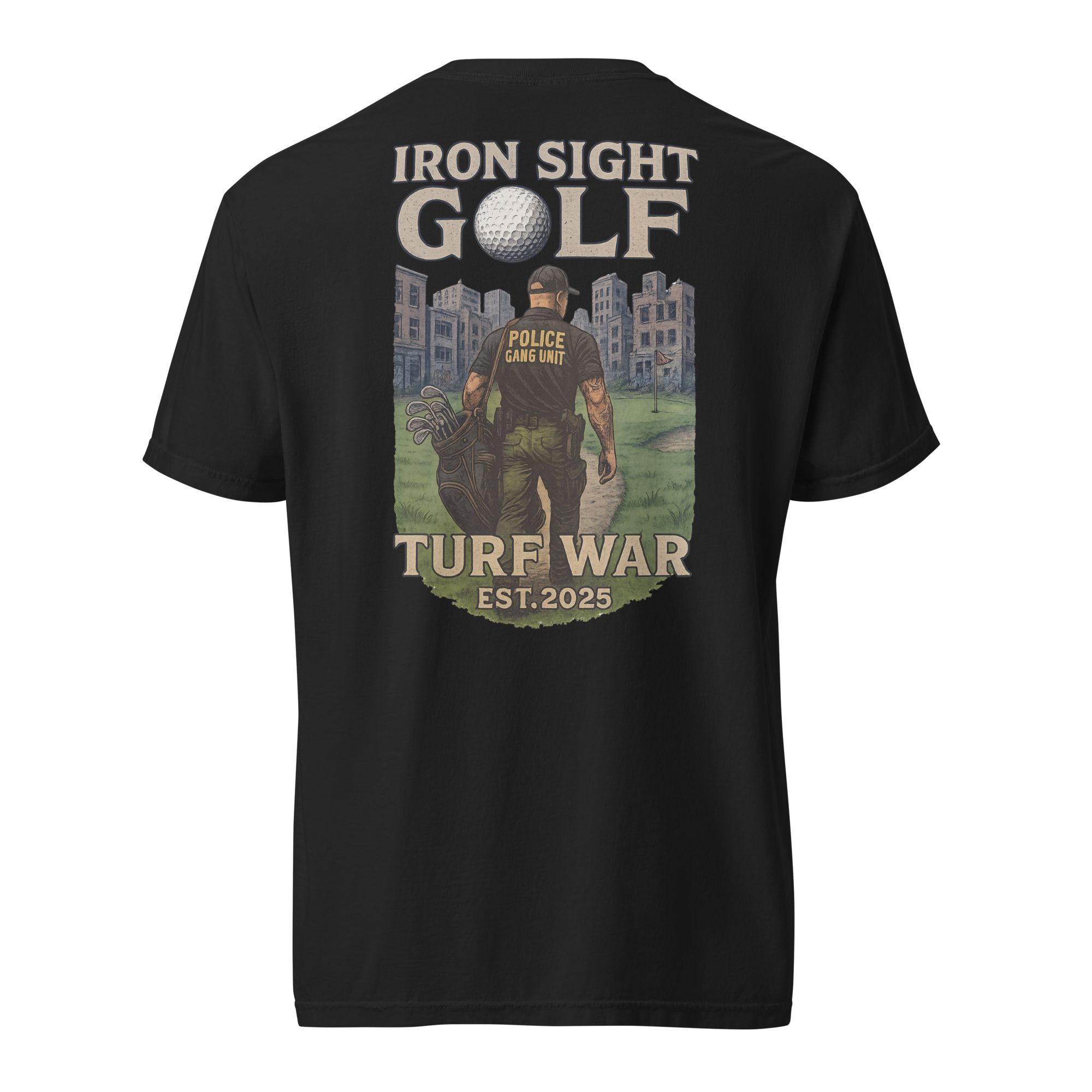 Honor the dedication of those who take on the toughest assignments with the Iron Sight Golf “Turf War” tee. Featuring a high-definition design of a gang unit officer walking down a golf fairway in the middle of a turf war—on the course and on the streets—this shirt captures the grit, focus, and determination it takes to win in any arena. Built with durable fabric and a structured fit, it delivers lasting comfort and a confident look round after round.