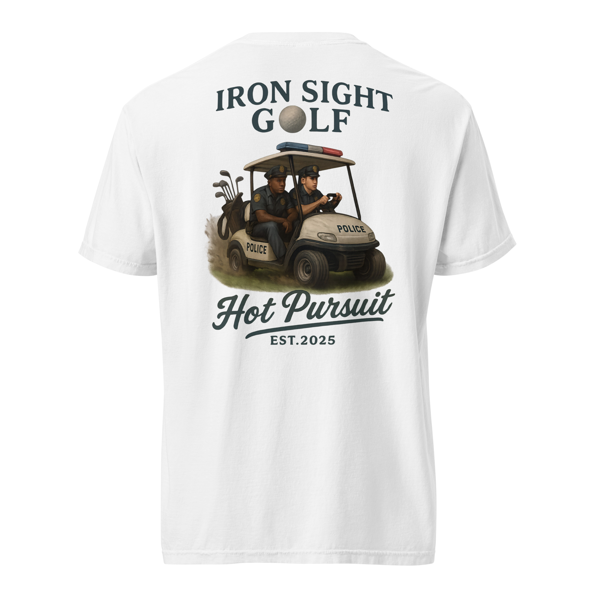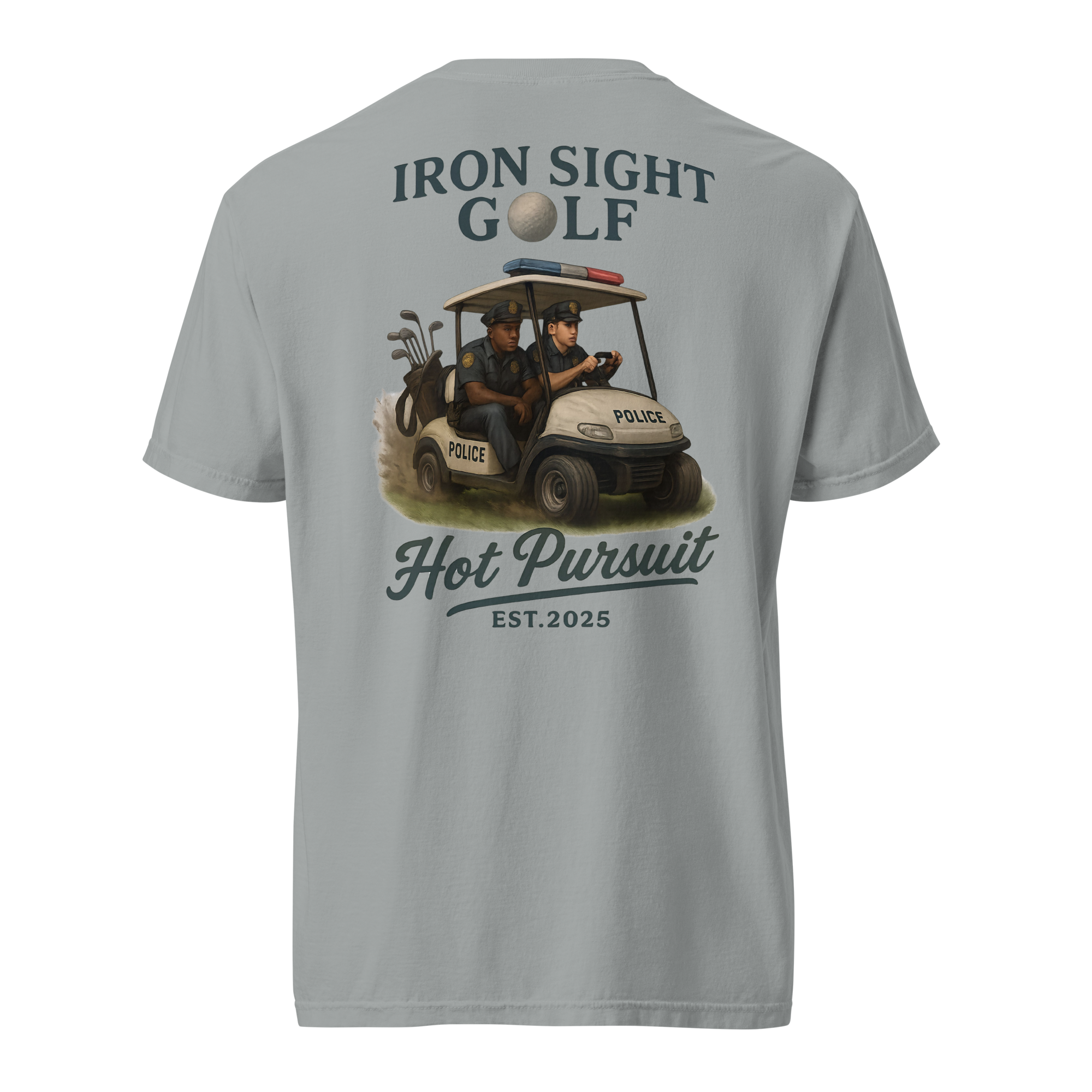 From the course to the chase, keep your game in high gear with the Iron Sight Golf – Hot Pursuit tee.