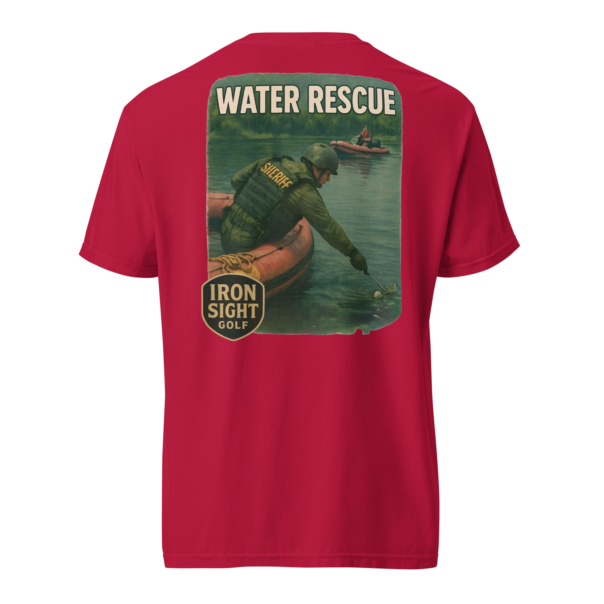 Make a splash on and off the course with the Water Rescue Cotton Tee. This fun design pays tribute to the Sheriff’s Water Rescue Team—only this time, the “rescue” is all about saving your golf ball from the drink. Featuring a detailed water rescue boat swooping in for a golf ball retrieval, this tee blends humor, creativity, and golf culture into one unique piece.