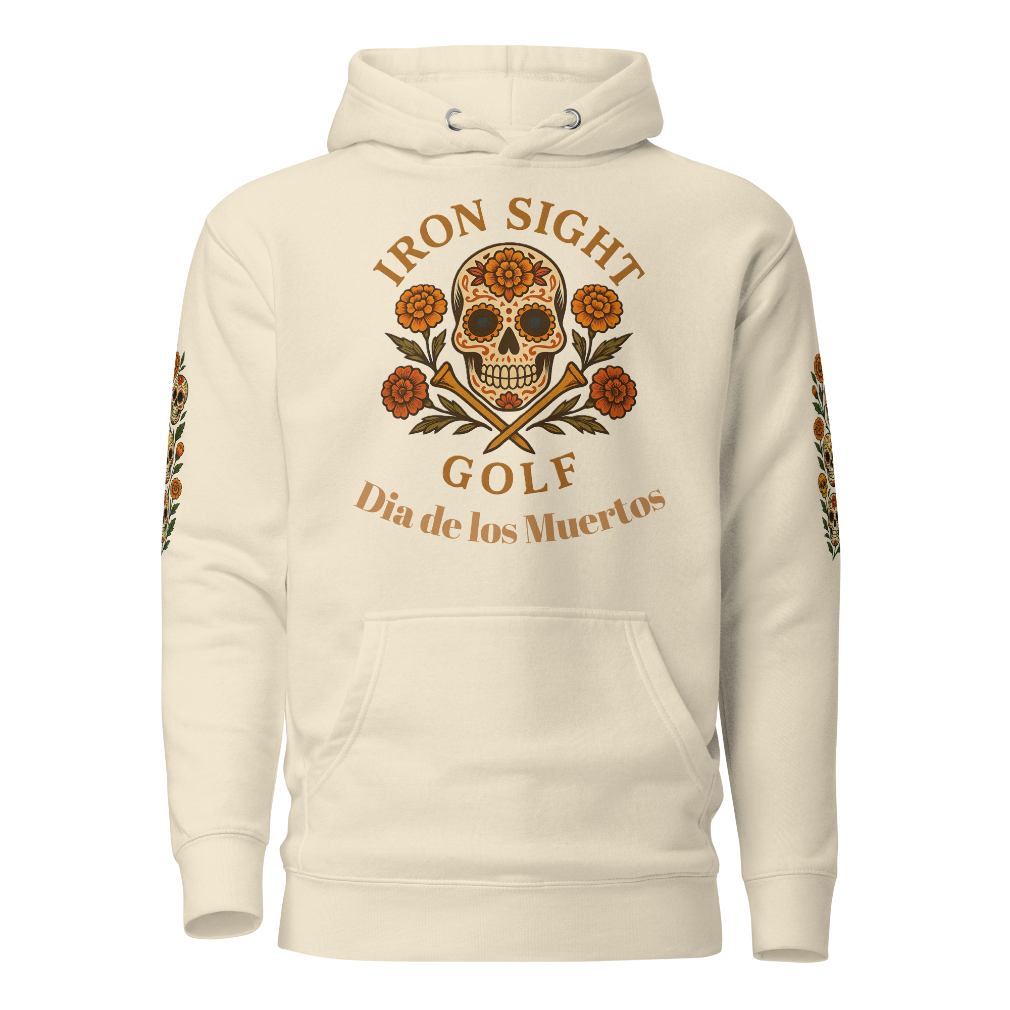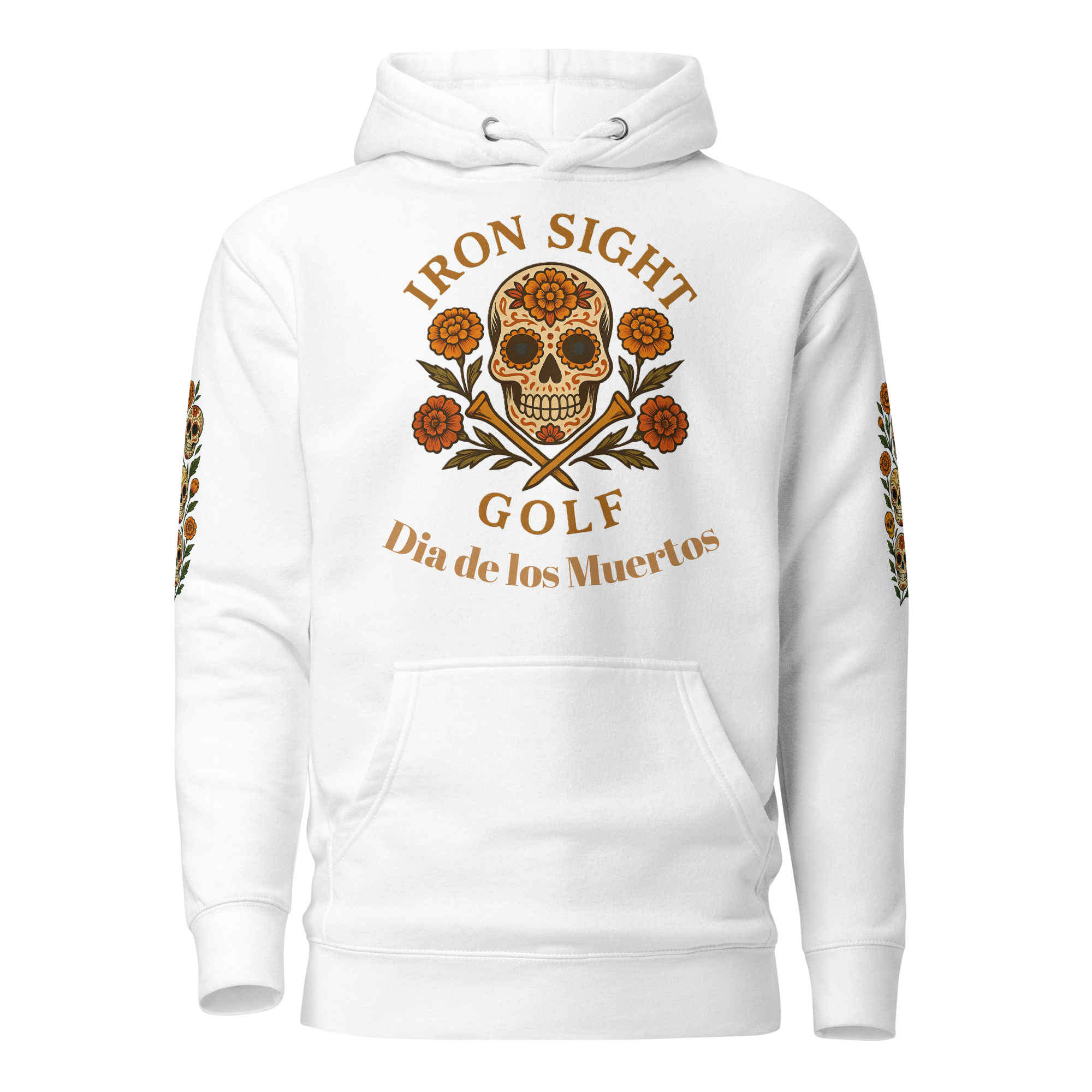 Honor tradition and showcase bold style with our Día de los Muertos Hoodie. Featuring the striking Iron Sight Golf sugar skull and marigold design on the front, this hoodie celebrates life, culture, and the everlasting love of the game. The artwork continues down both sleeves with beautifully detailed skulls and marigold flowers, making this piece a true standout on and off the course.