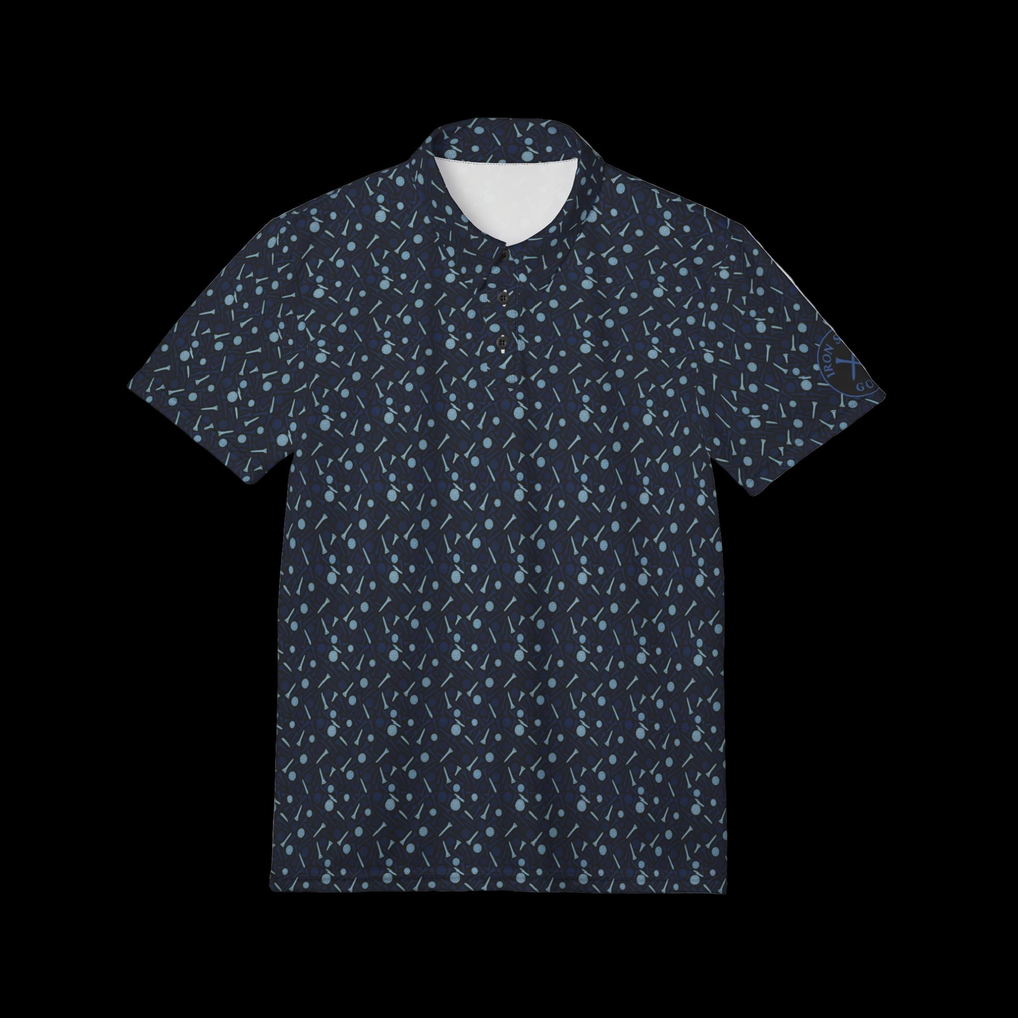 Turn heads on and off the course with the Iron Sight Golf Blue Balls Polo, a sleek fusion of performance and personality. This bold design features an all-over pattern of deep and light blue golf balls and tees set against a midnight backdrop—striking the perfect balance between classic cool and playful edge.