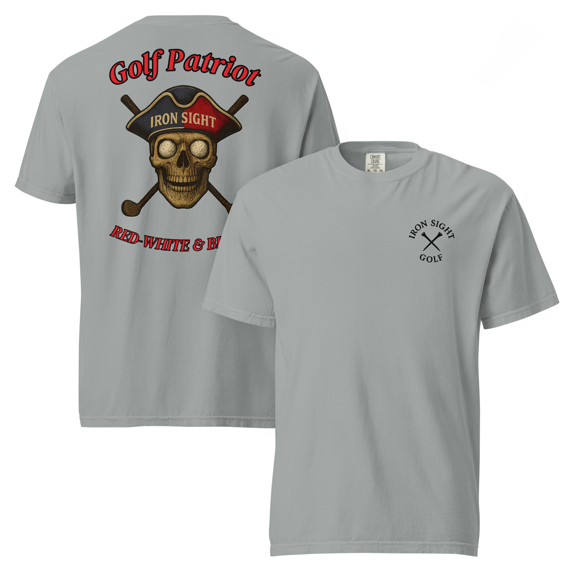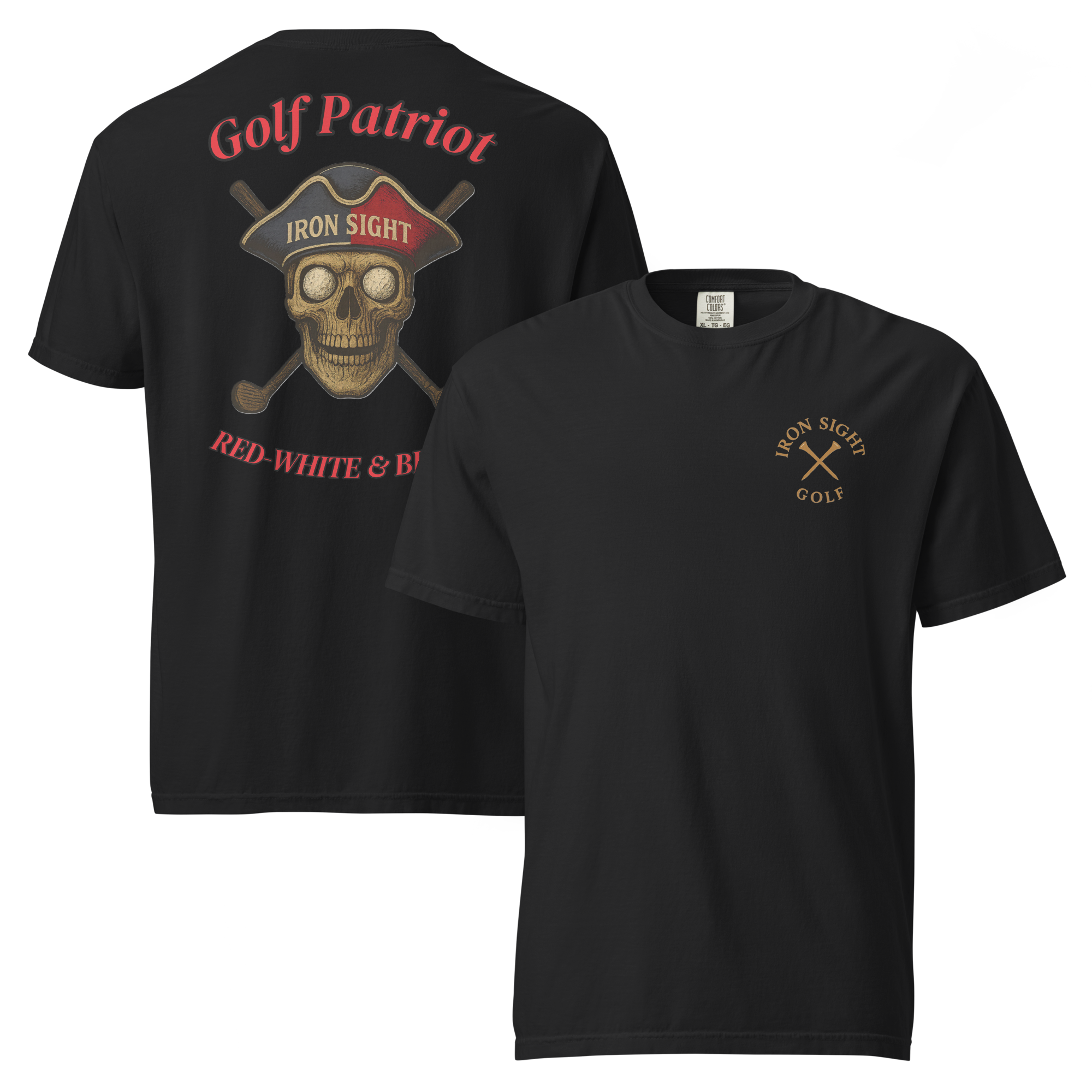 The Golf Patriot Tee is all about pride, grit, and love of the game. Featuring a Revolutionary War–style patriot skull with piercing golf ball eyes and a classic tricorn hat, this design pairs American heritage with golf’s timeless spirit. With the slogan “Red, White & Birdies”, this tee is perfect for golfers who bring passion, freedom, and fire to every round.
