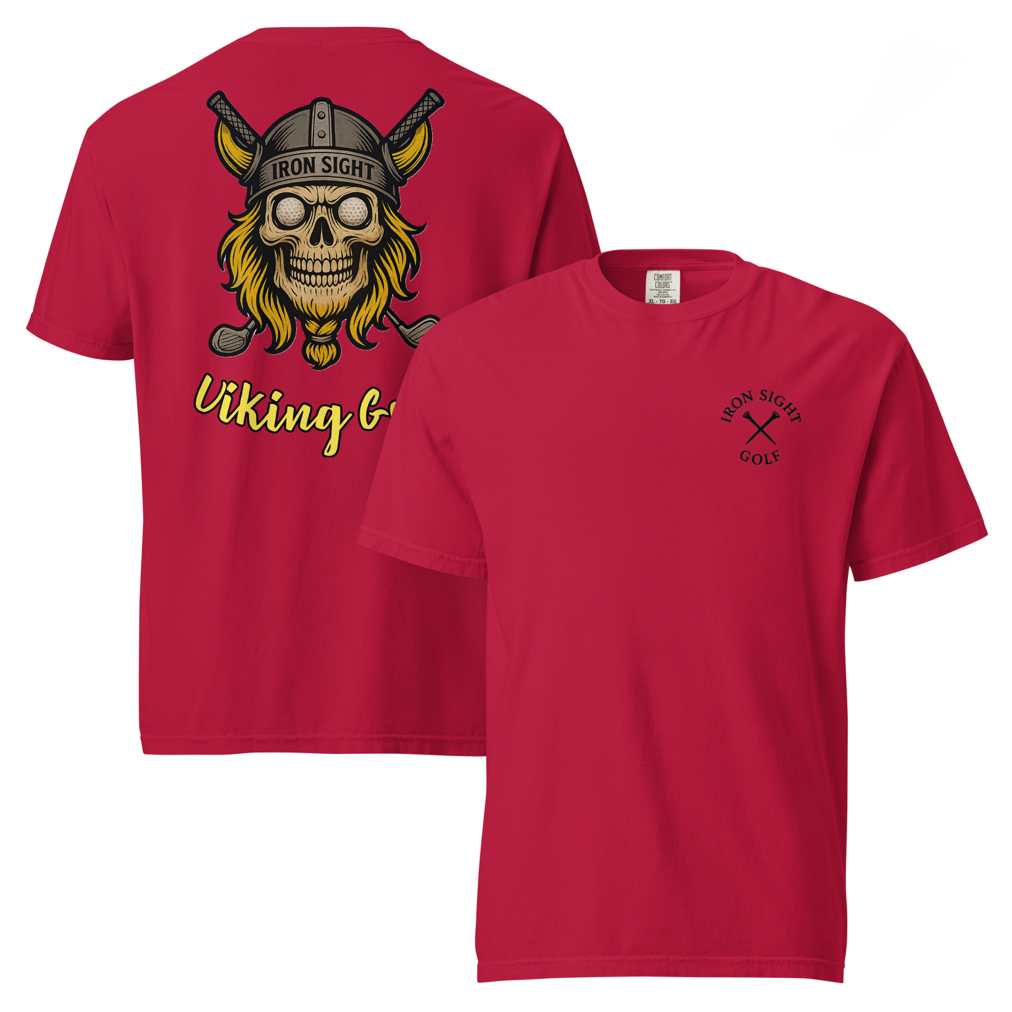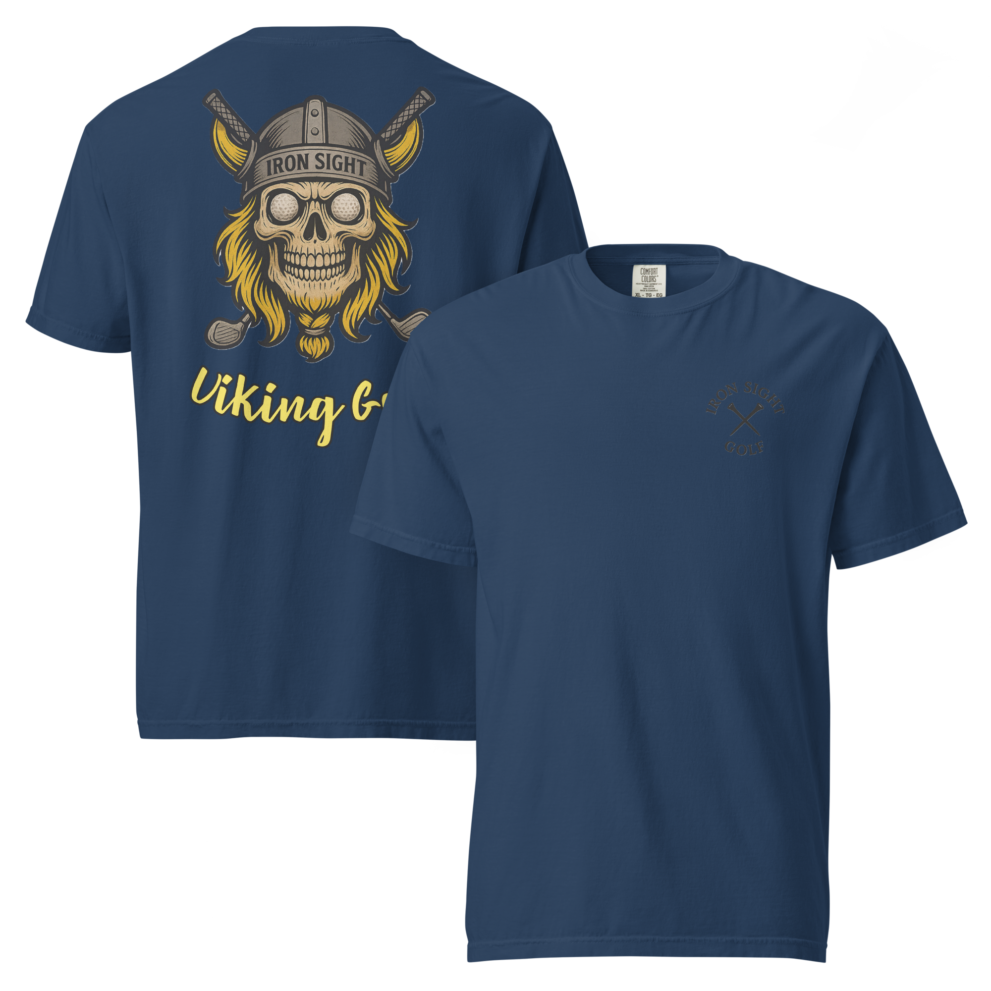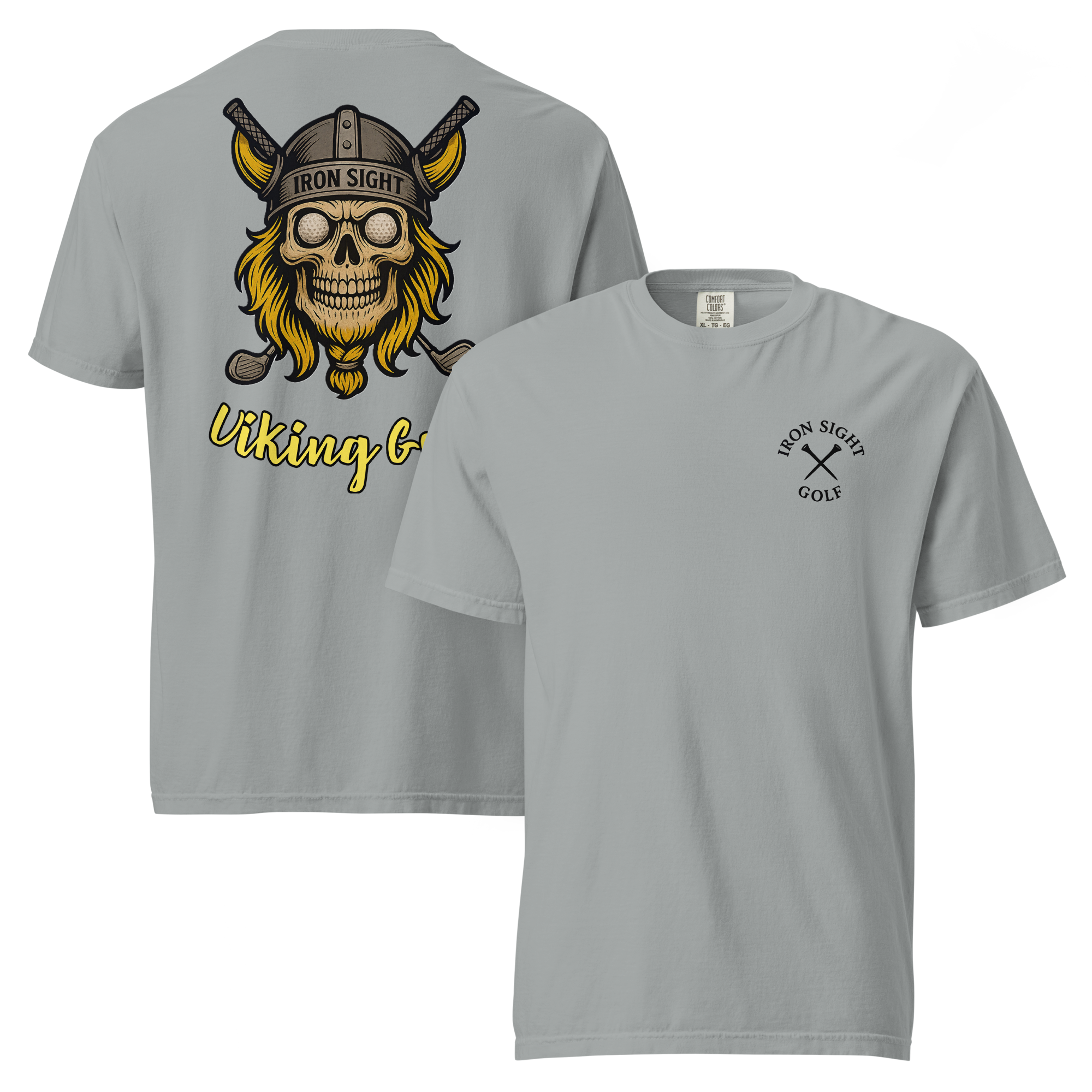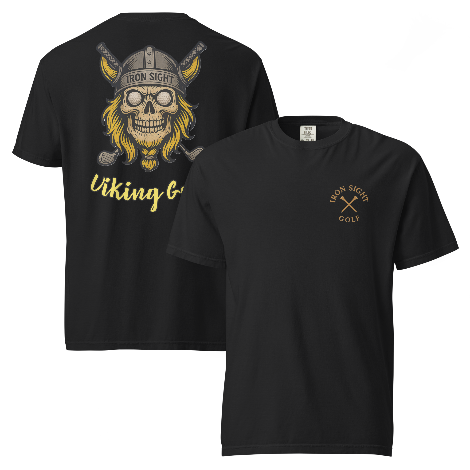 The Viking Golf Tee taps into the fearless spirit of warrior's past. Featuring a Viking skull clad in a traditional helmet with golf ball eyes, this bold design pays tribute to the idea that golf has been around since the Viking days. A centerpiece of the Iron Sight Sports Collection, this tee embodies strength, grit, and a love of the game that stands the test of time.