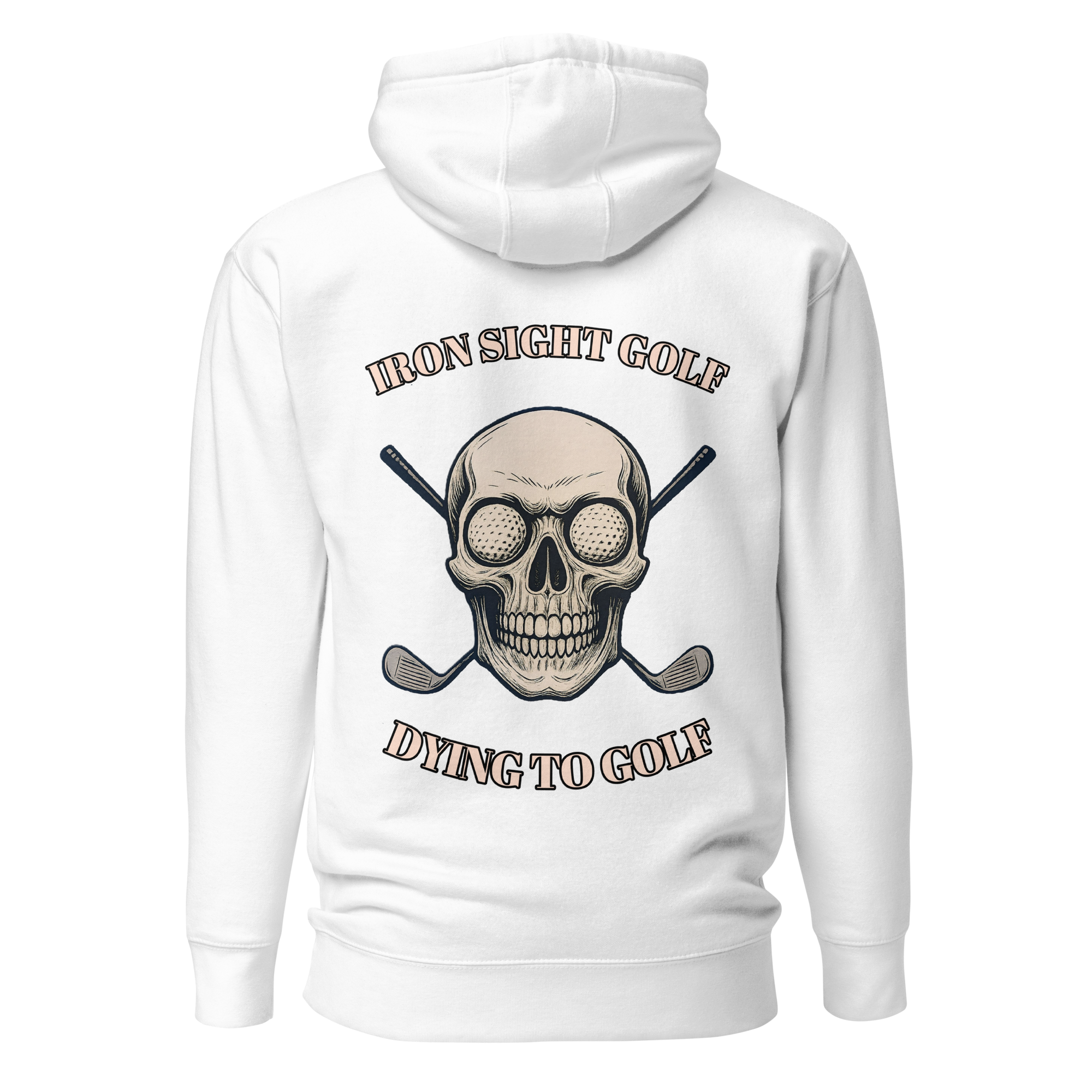 Show your unshakable love for the game with the Iron Sight Golf “Dying to Golf” Hoodie. Featuring the same bold, high-definition design as the tee—a striking human skull with golf balls in its eye sockets and crossed golf clubs behind it—this hoodie embodies the relentless, lifelong passion for golf. Perfect for cooler days on the course or casual wear off it, this hoodie blends comfort, durability, and unmistakable style.