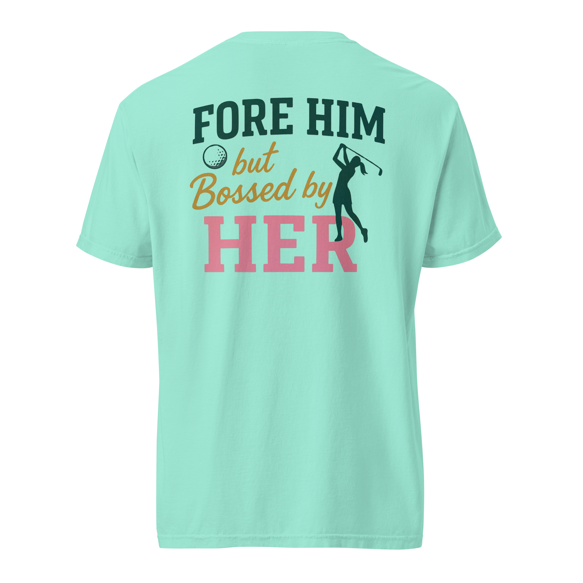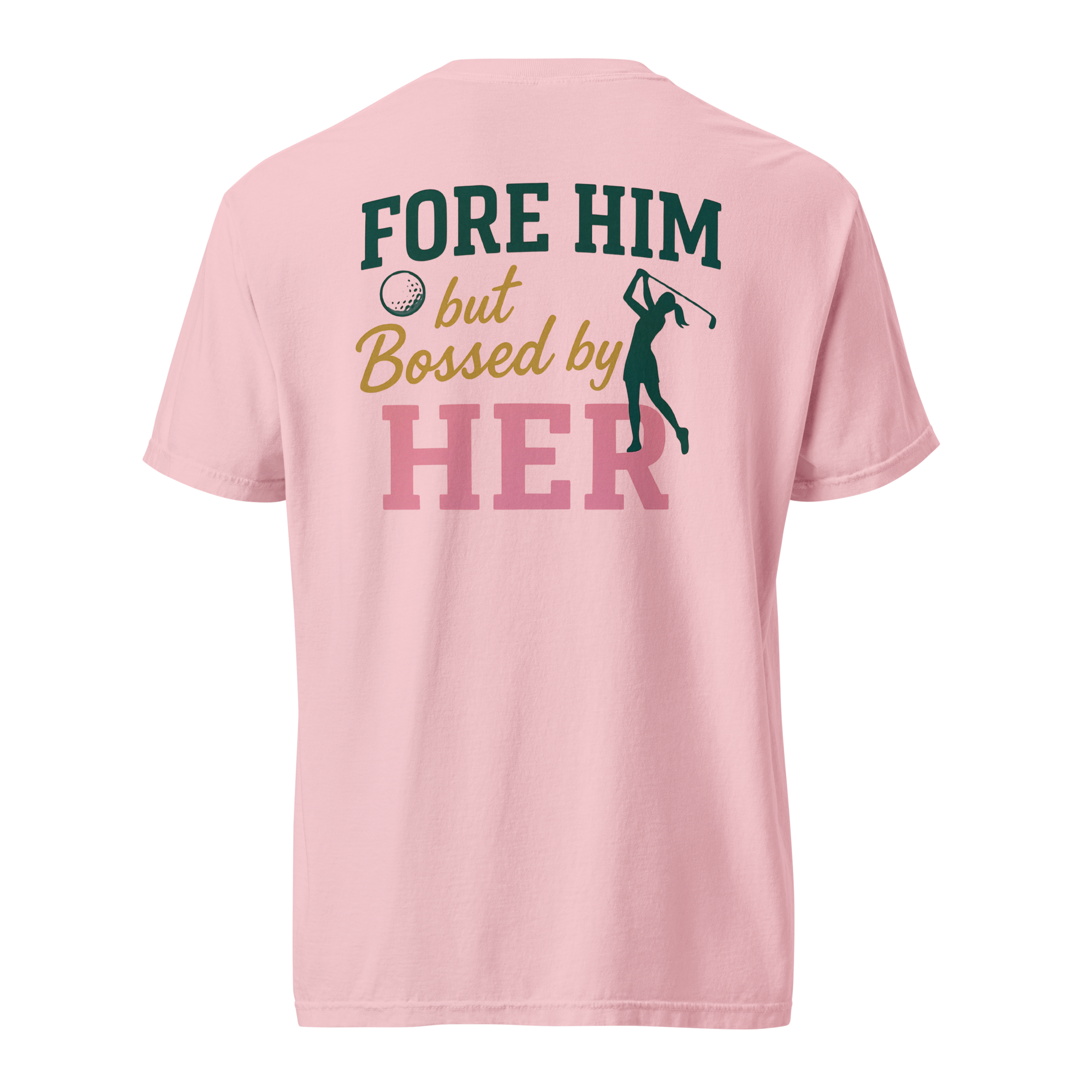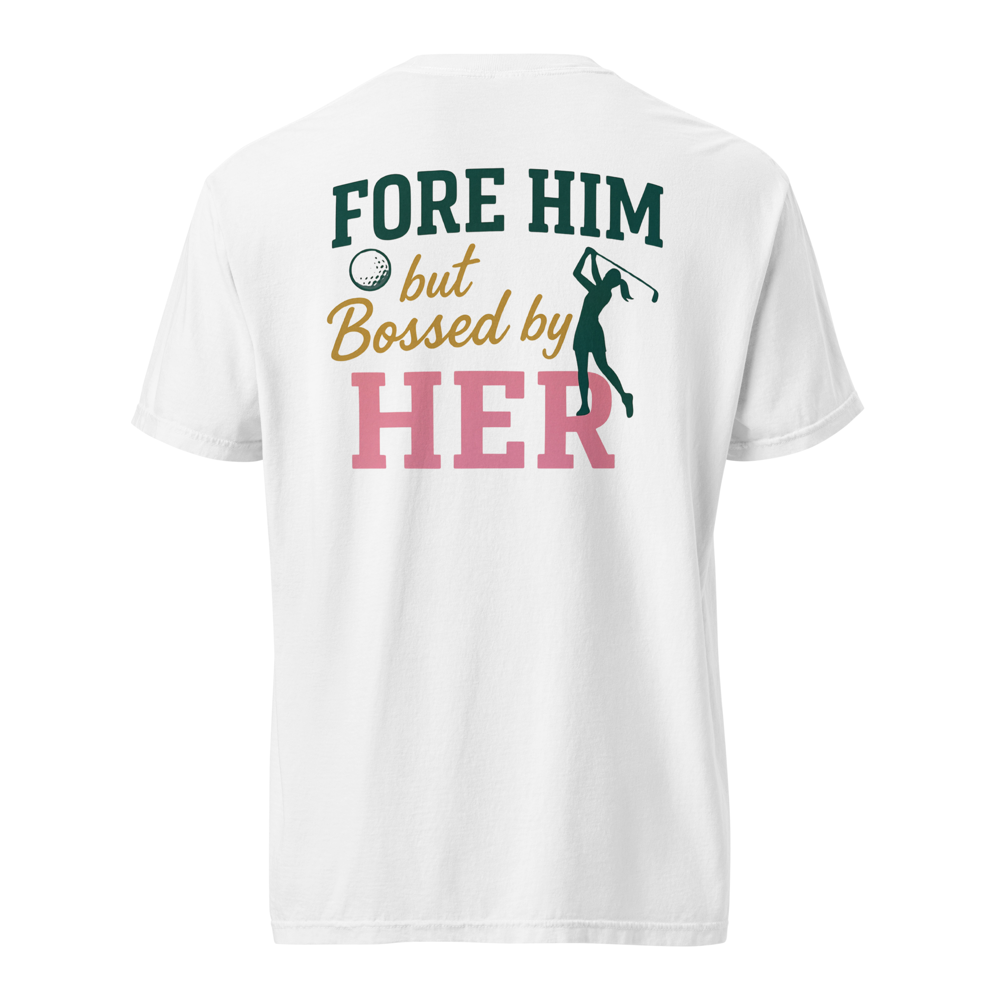 Bring humor and style to the course with the Fore Him but Bossed by Her Tee. This playful design highlights the perfect balance between golf passion and real-life partnership—because while he might swing the club, she’s calling the shots. Crafted from premium cotton, it’s soft, durable, and ready for any outing.