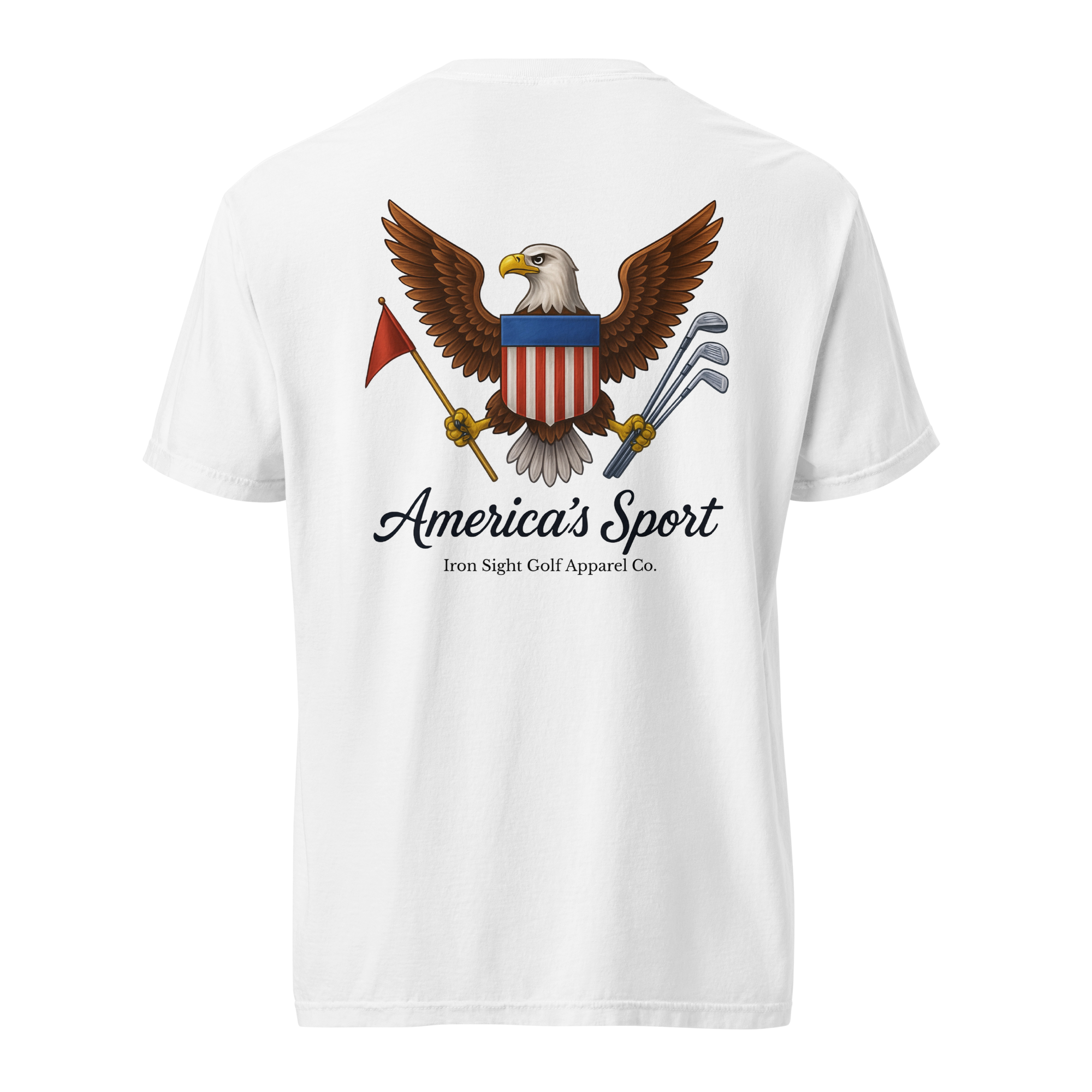 Celebrate freedom, strength, and the spirit of the game with the American Eagle Cotton Tee. Featuring a bold eagle clutching golf clubs and a flag, this design pays tribute to America’s love of golf—America’s Sport. Crafted for comfort and built to last, this premium tee combines classic style with everyday versatility.