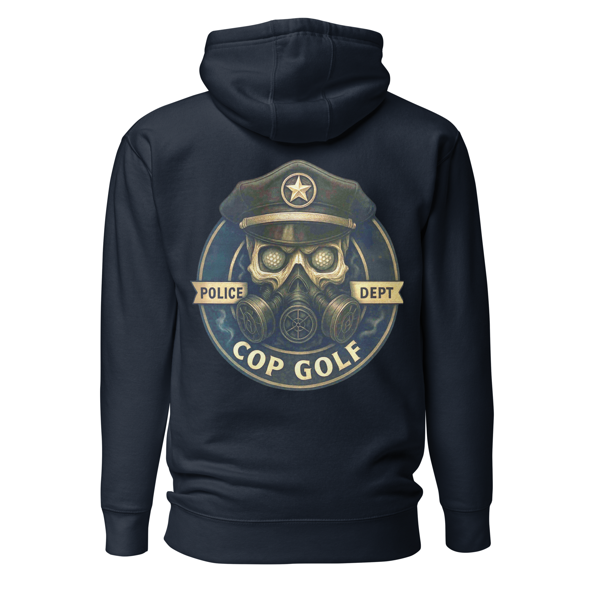 Stay warm and geared-up with the Cop Golf Hoodie, a bold blend of law-enforcement grit and golf-course attitude. Featuring the signature Iron Sight Golf “Cop Golf” emblem, this design showcases a detailed skull wearing a police service cap, gas mask, and golf-ball eyes—set inside a rugged, smoke-filled badge circle. It’s the perfect hoodie for officers, supporters, and anyone who loves that tactical-meets-golf style.