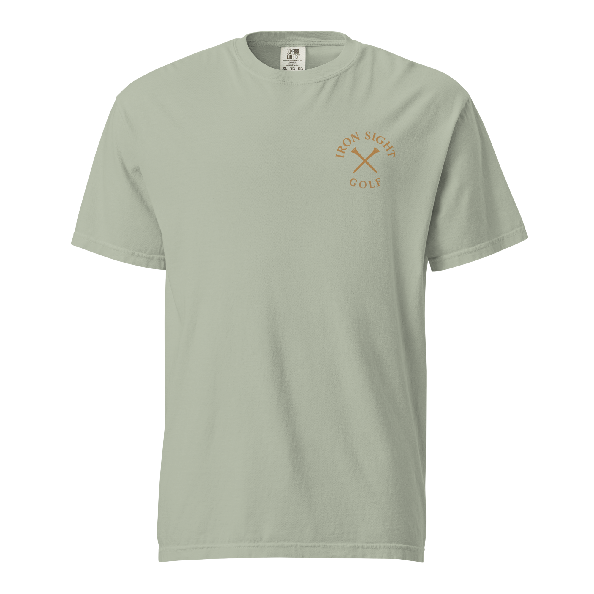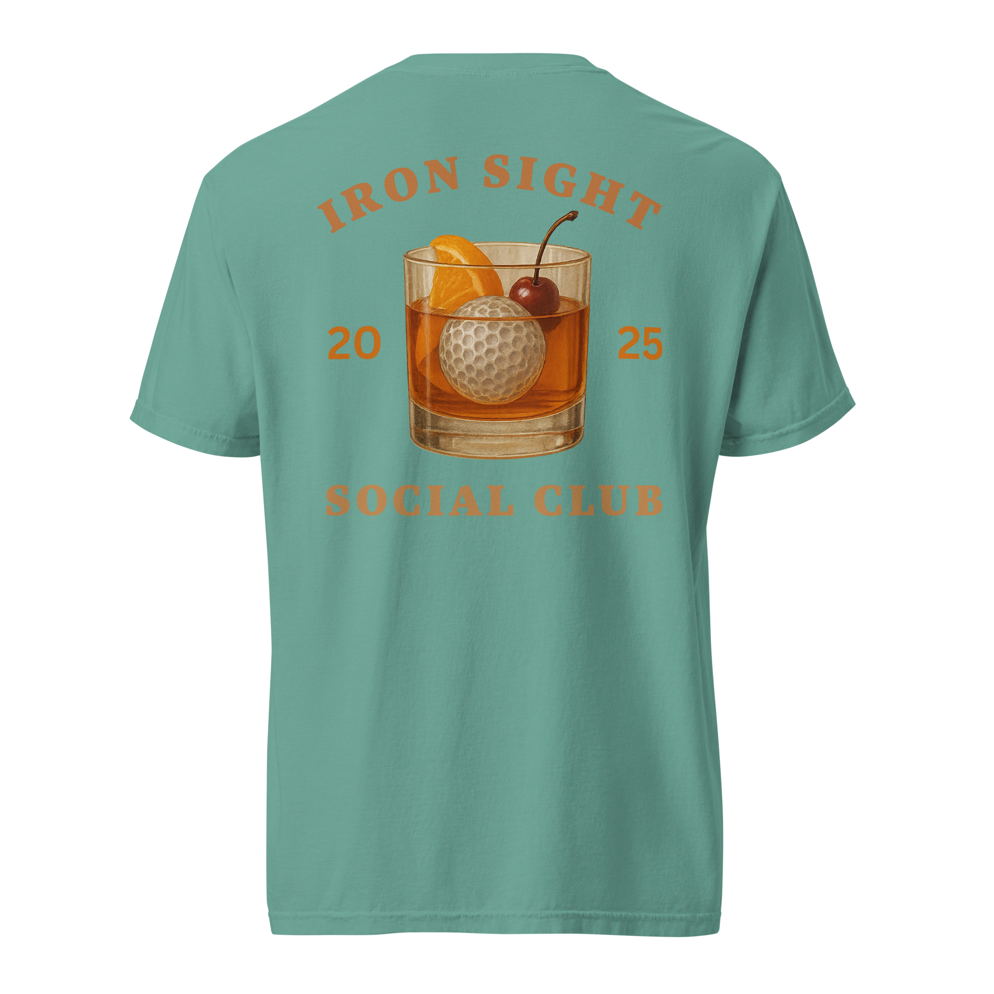 Raise a glass to the social side of the game with the Iron Sight Social Club Tee. Featuring an Old- fashioned cocktail reimagined with a golf ball, orange slice, and bourbon cherry, this design celebrates the relaxing, social spirit of golf—where the best rounds end with good drinks and great company. Bold artwork and premium comfort make this tee perfect for the course, the clubhouse, or a night out.