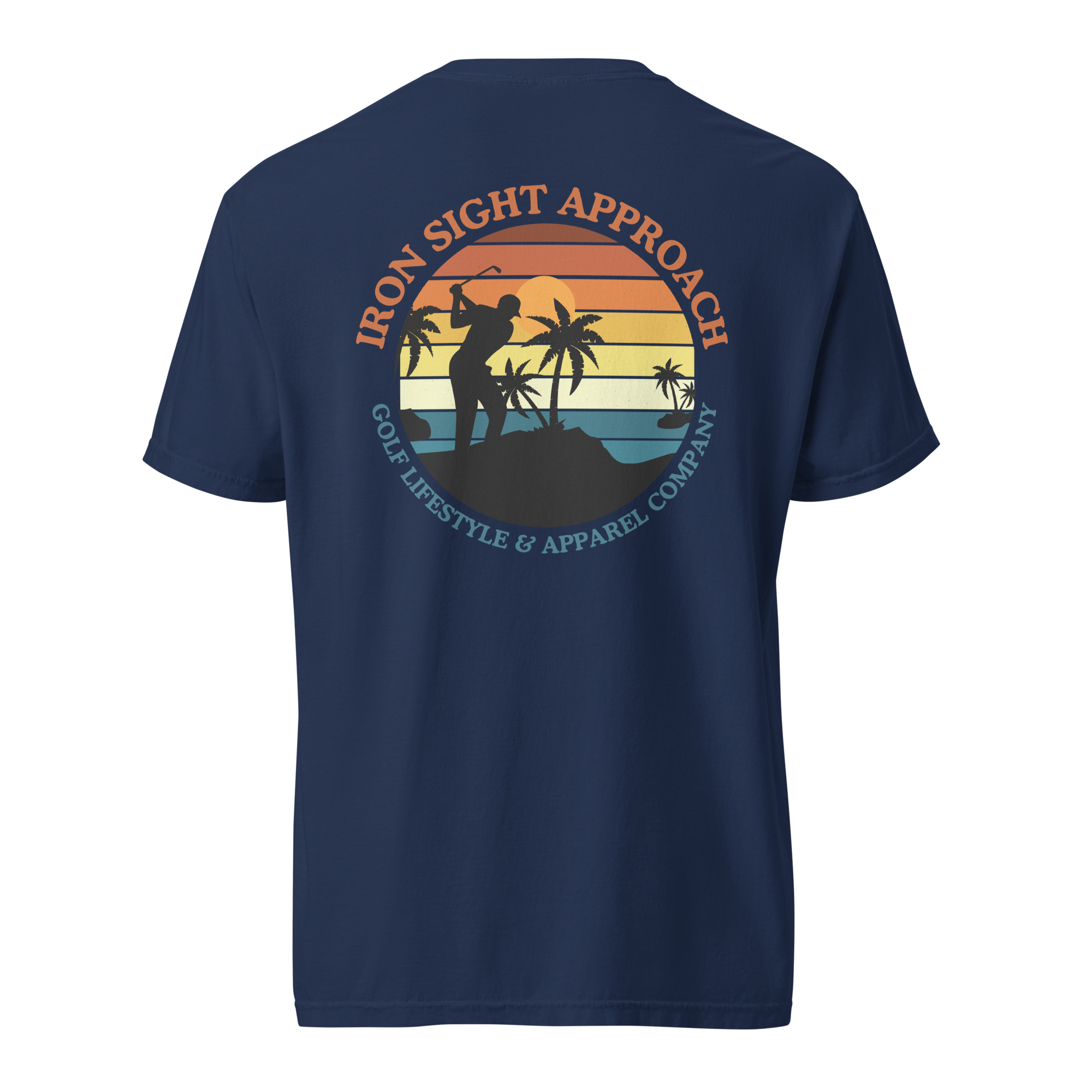 The Sunset Approach Tee captures the laid-back vibe of golf under golden skies. Featuring a striking silhouette of a golfer mid-swing against a radiant sunset backdrop, framed by palm trees and ocean hues, this design embodies the perfect blend of relaxation and precision. Whether you’re chasing birdies or beachside sunsets, this shirt celebrates the spirit of the game and the beauty of the moment.