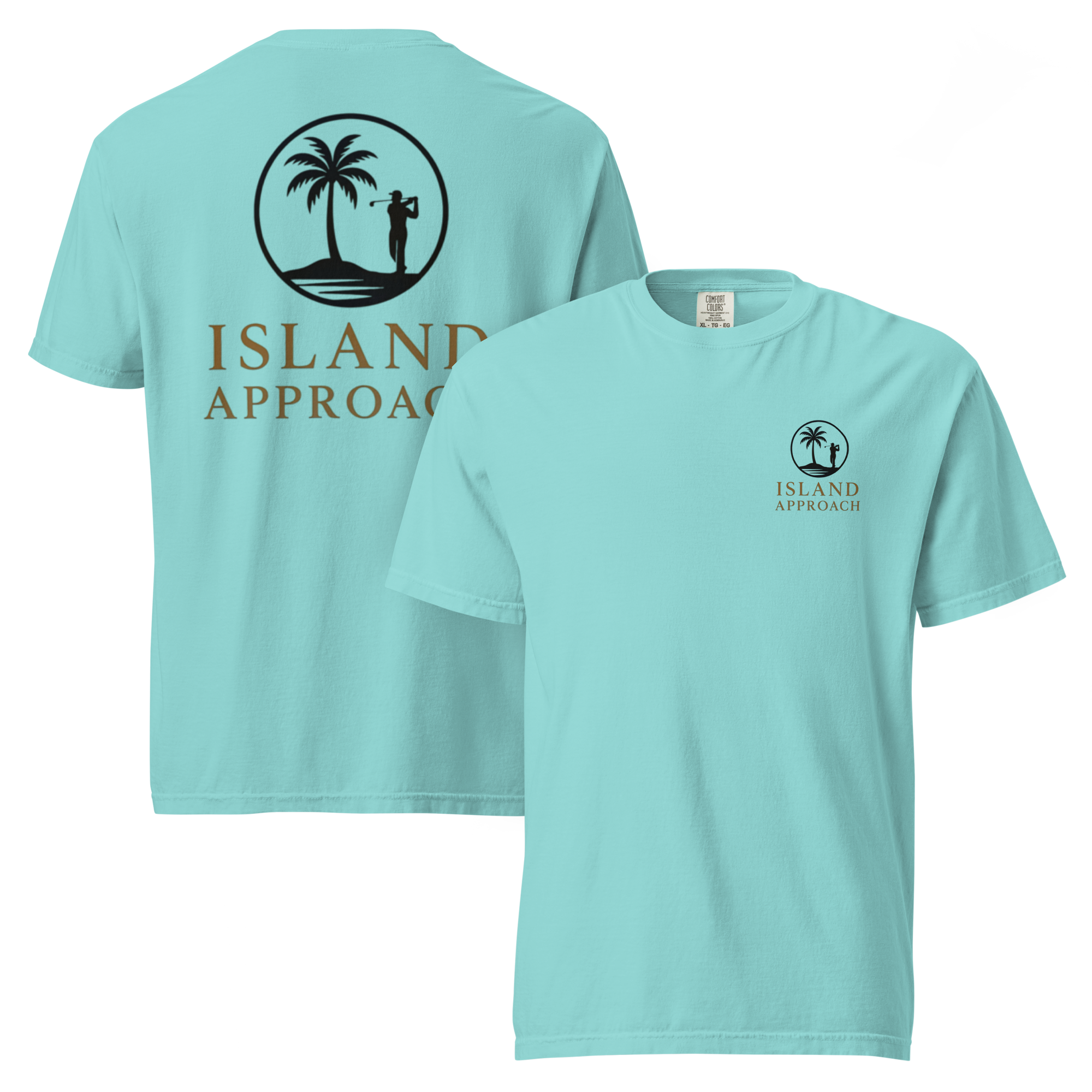 Bring the beauty of the tropics to your game with the Island Approach Logo Tee. Featuring the official Island Approach logo on the back—depicting a golfer mid-swing surrounded by palm trees, ocean views, and island charm—this shirt embodies the laid-back luxury of golf in paradise.