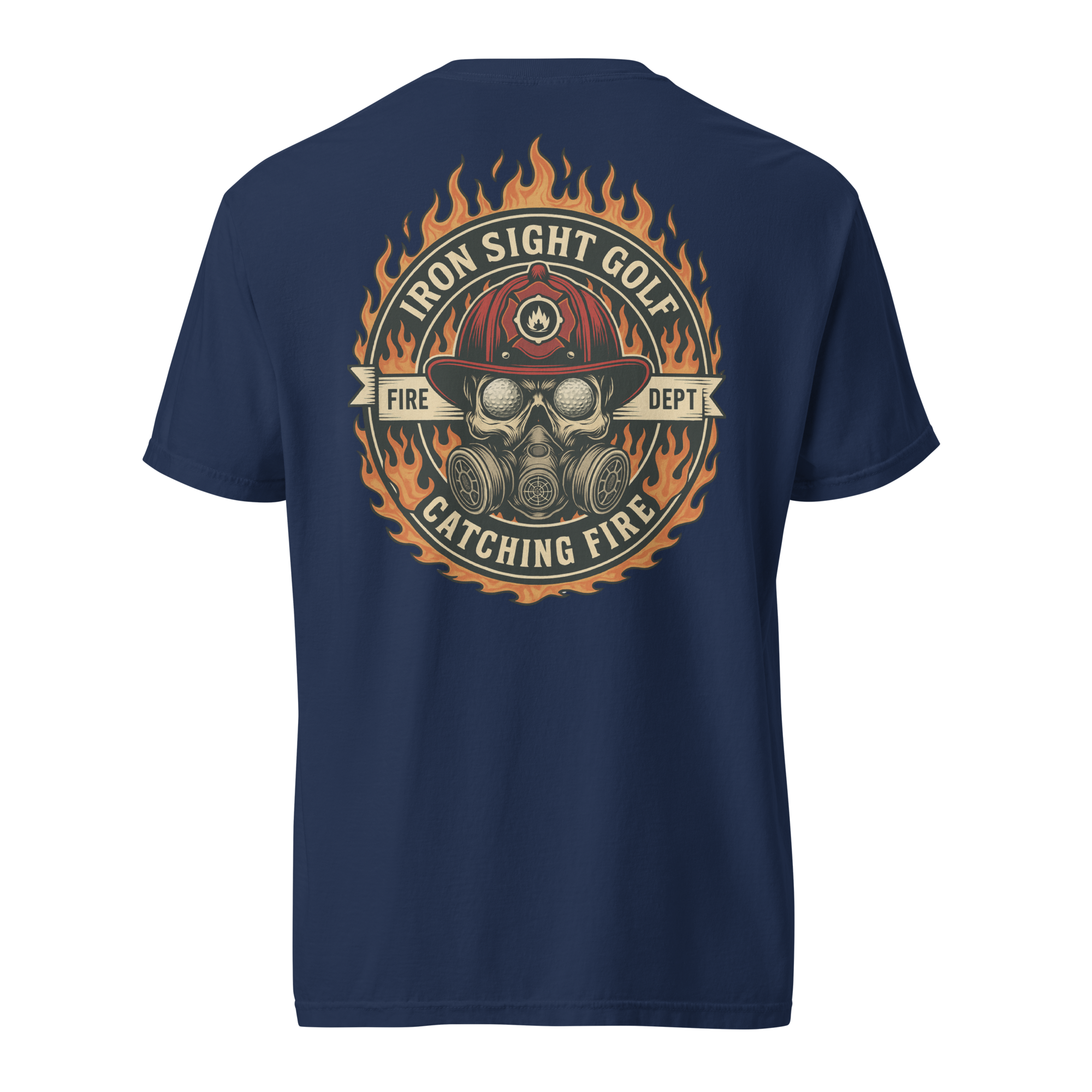 Turn up the heat with The Catching Fire Cotton Tee, featuring a powerful firefighter-inspired Iron Sight Golf design that blends intense artwork with premium comfort. The graphic showcases a skull in a red fire helmet, gas mask, and blazing flames—perfect for those who live with passion, grit, and a warrior mindset.