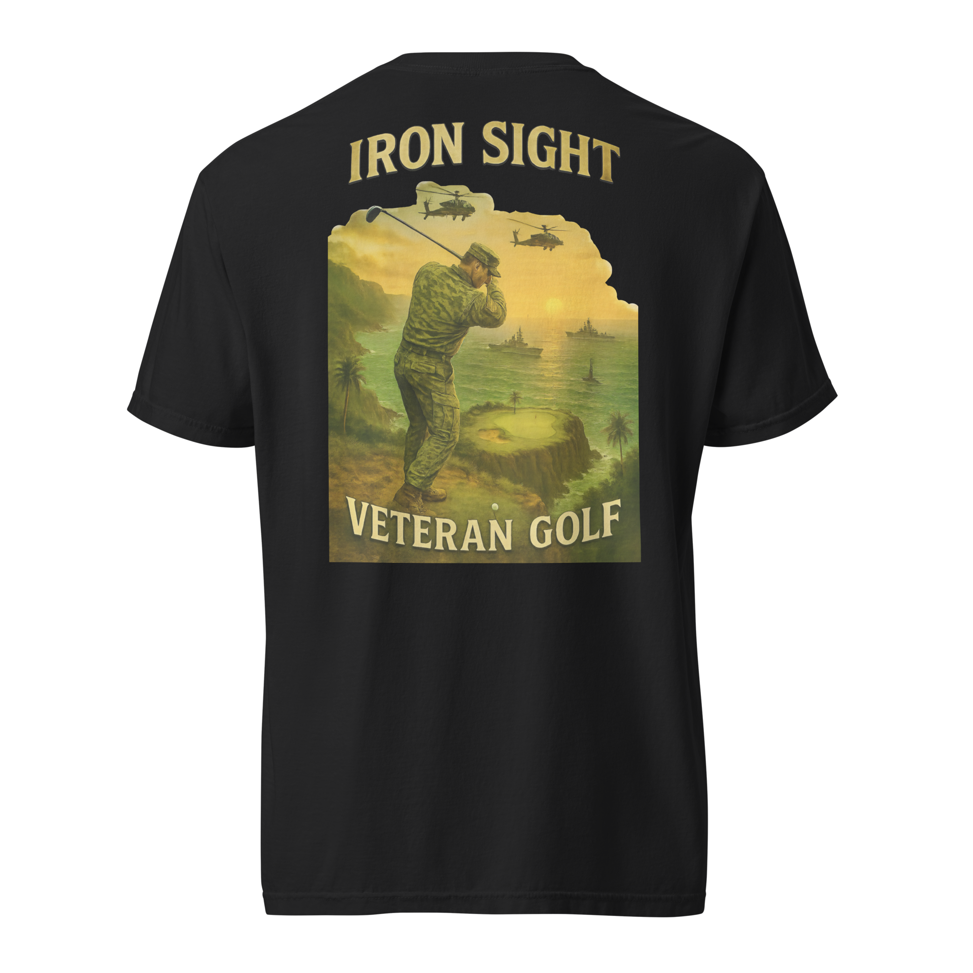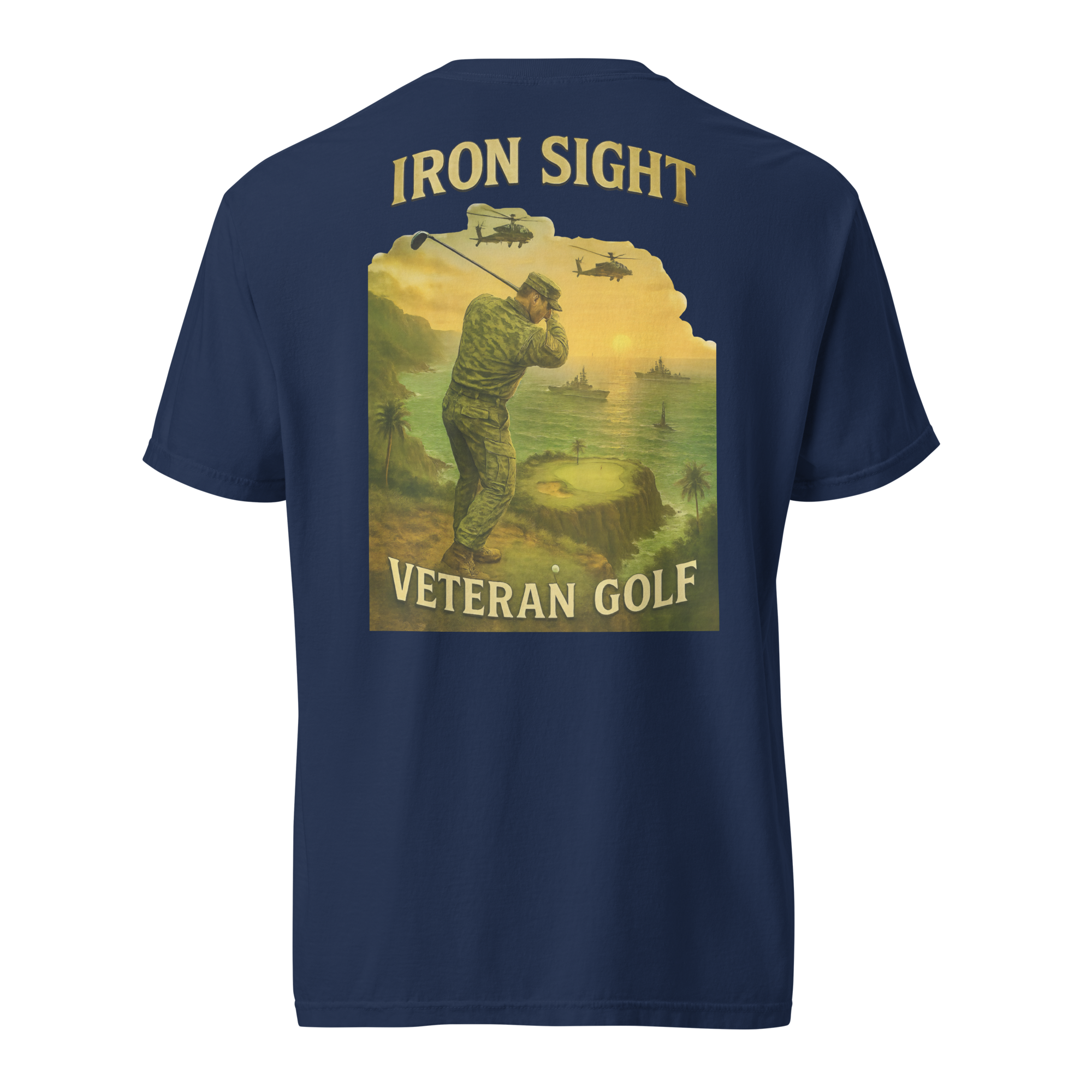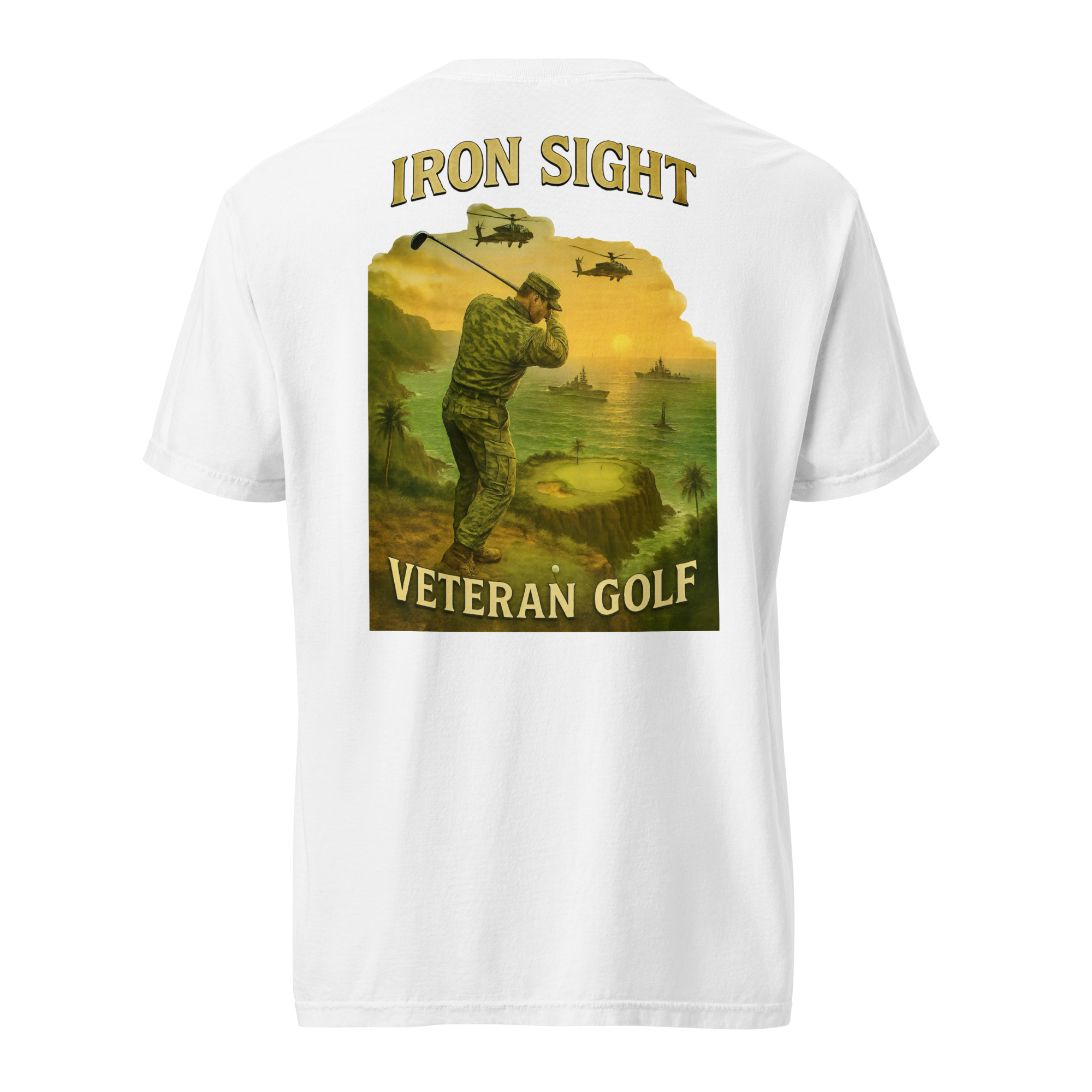 Crafted from premium cotton with a relaxed fit, this tee delivers comfort and durability—perfect for the course, casual wear, or showing pride in service. A signature piece in the Iron Sight Golf collection, it represents the unbreakable spirit of America’s veterans both on and off duty.