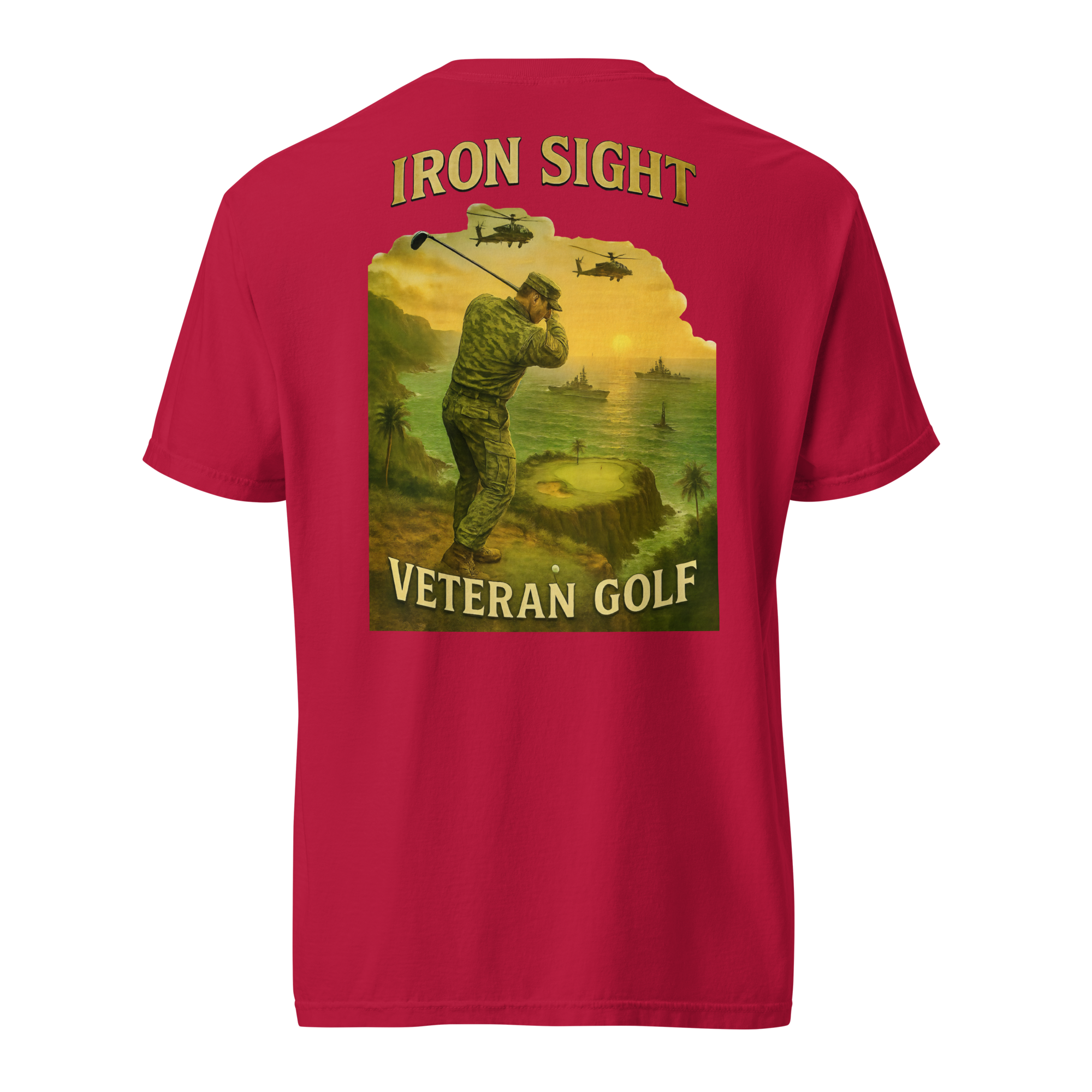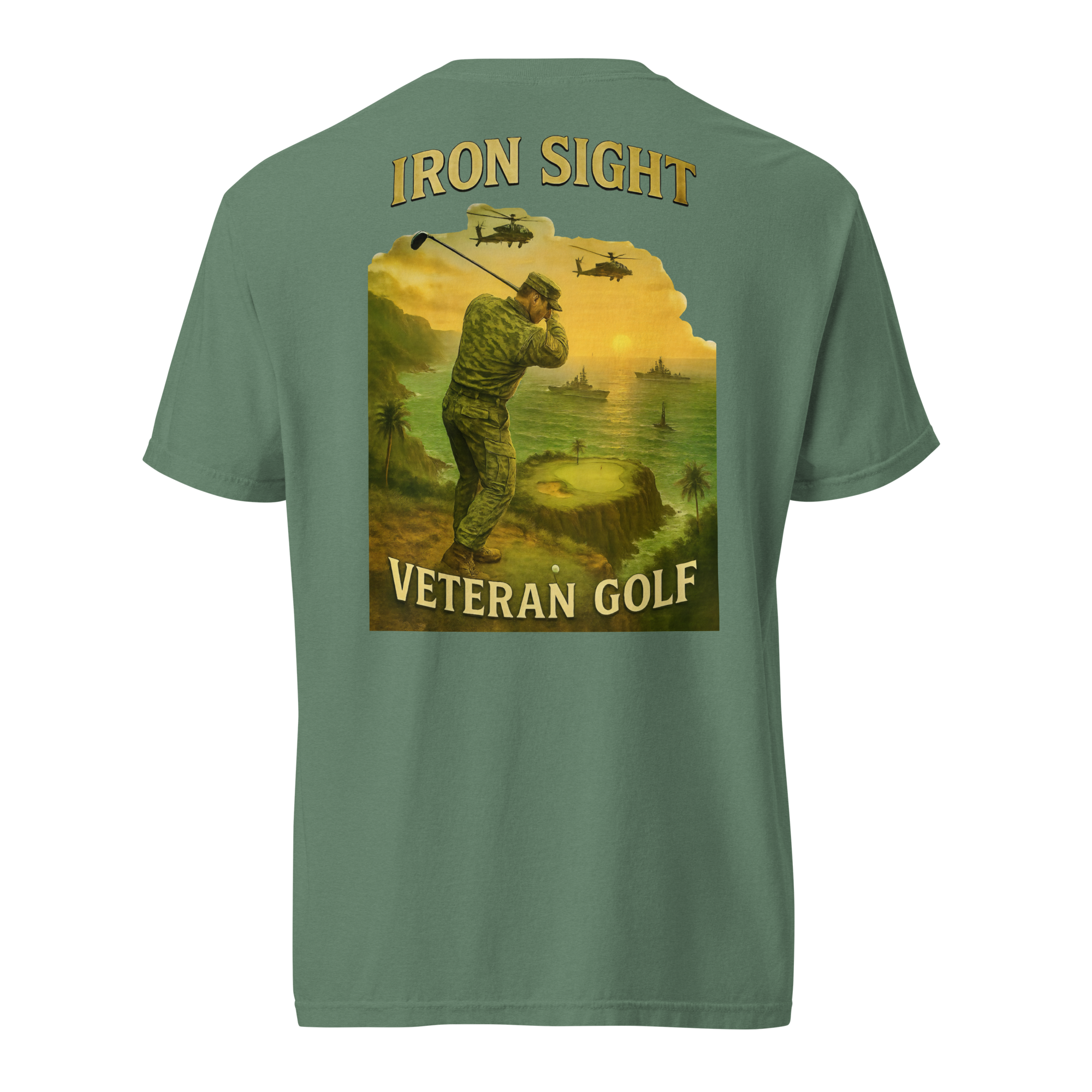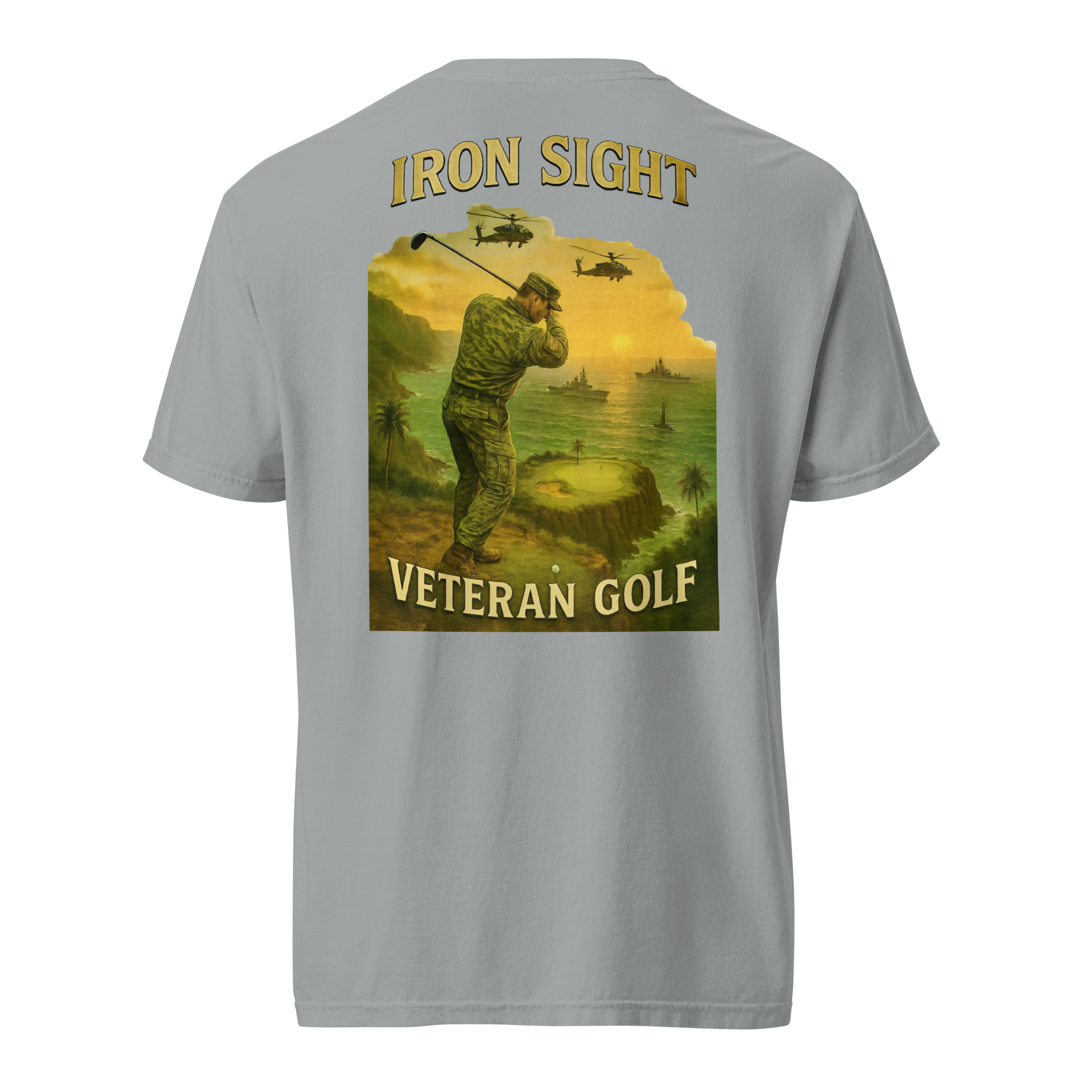 Crafted from premium cotton with a relaxed fit, this tee delivers comfort and durability—perfect for the course, casual wear, or showing pride in service. A signature piece in the Iron Sight Golf collection, it represents the unbreakable spirit of America’s veterans both on and off duty.