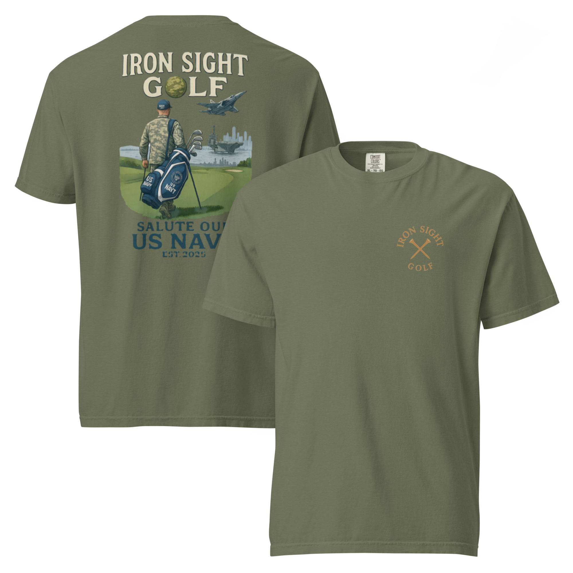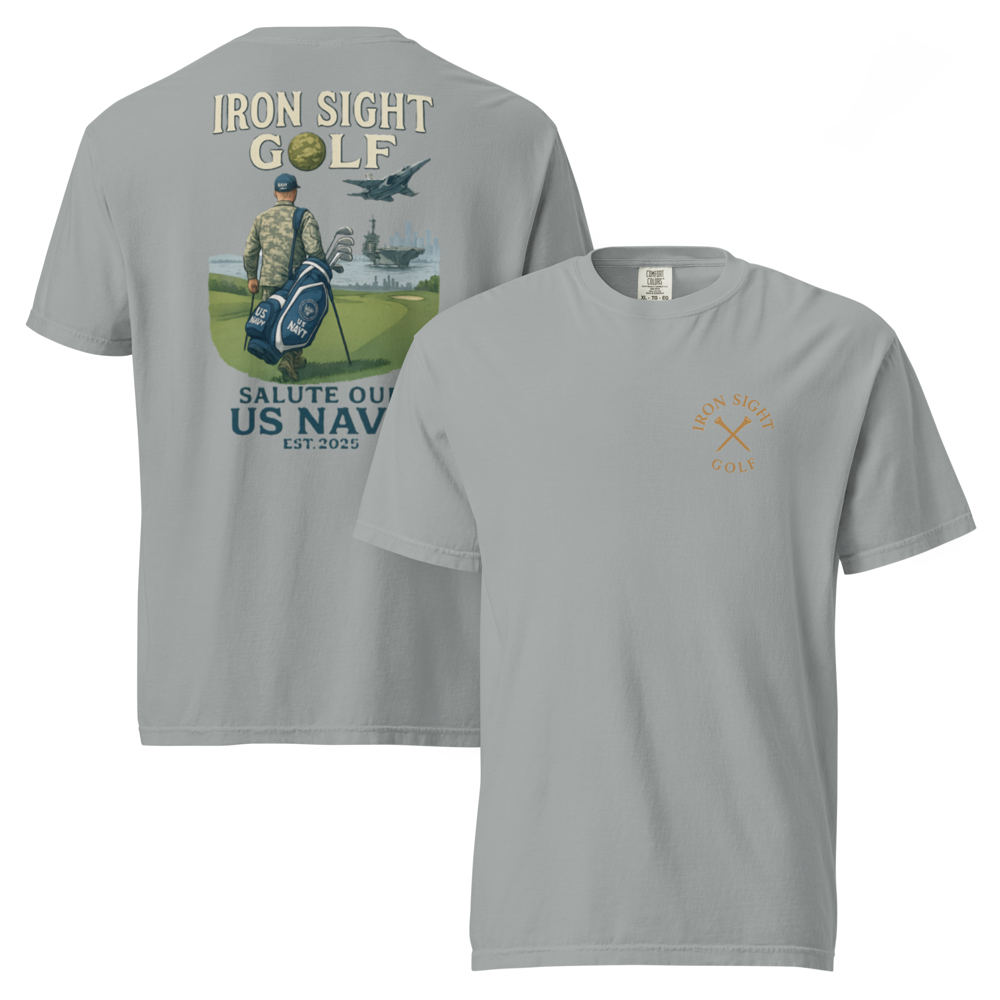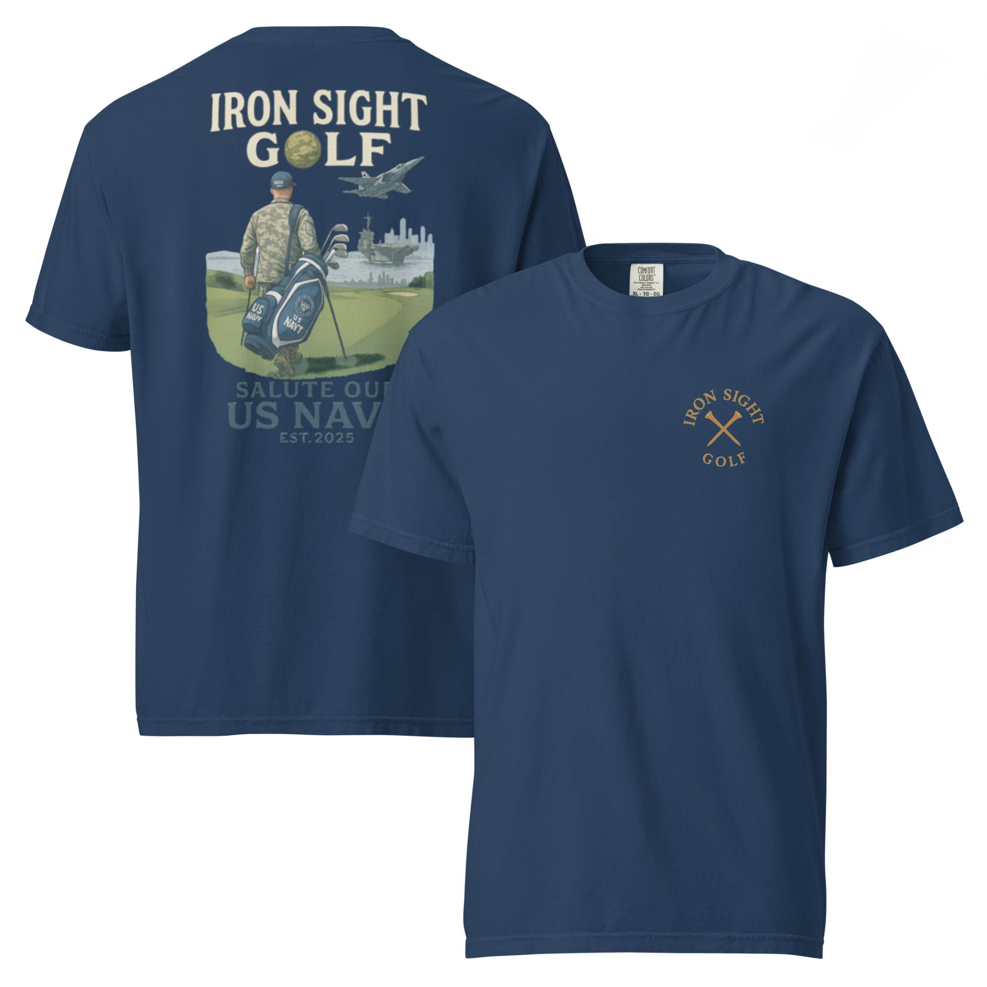 Veteran Tribute Design: Proudly displays “Navy – Salute Our Veterans” in the distinctive Iron Sight Golf style.