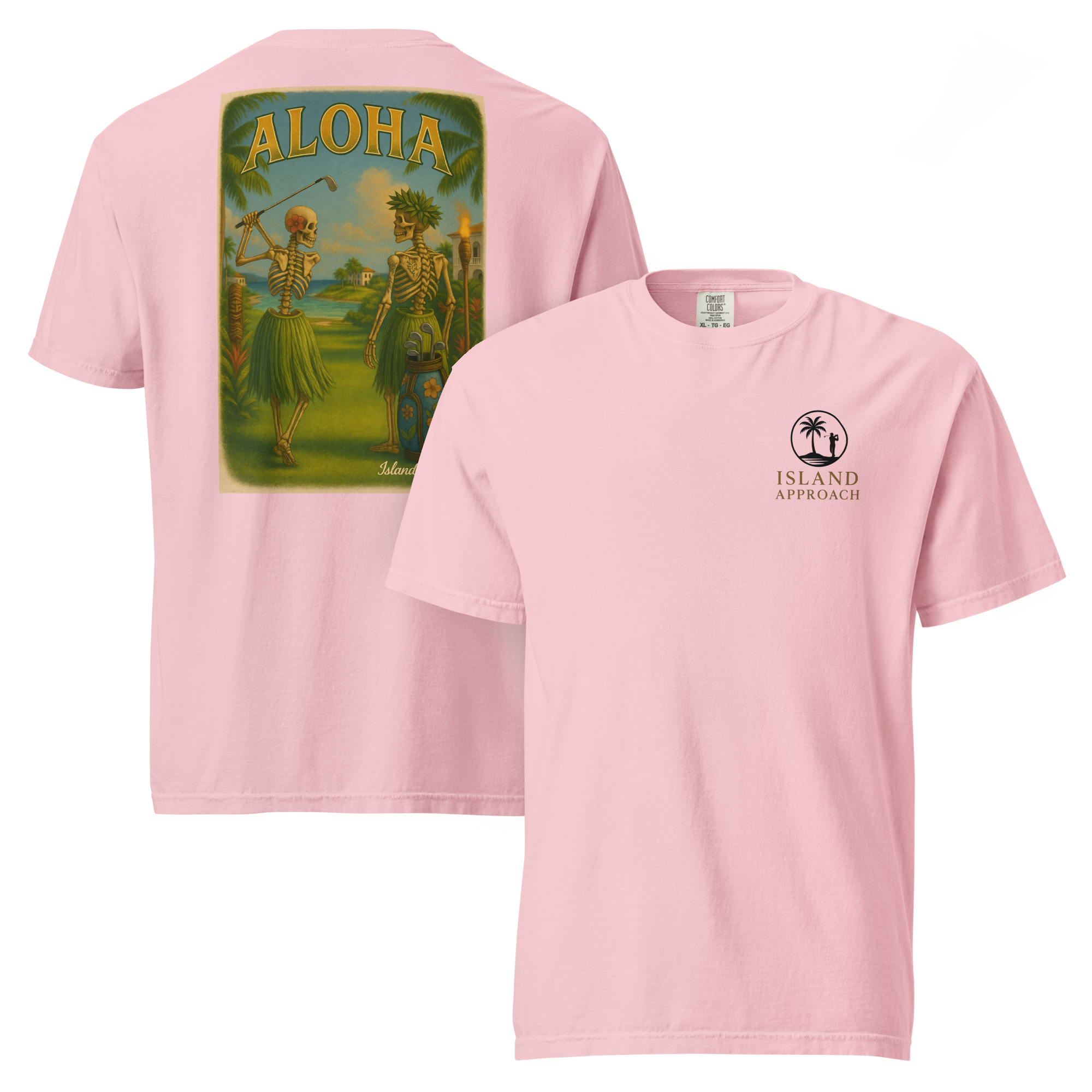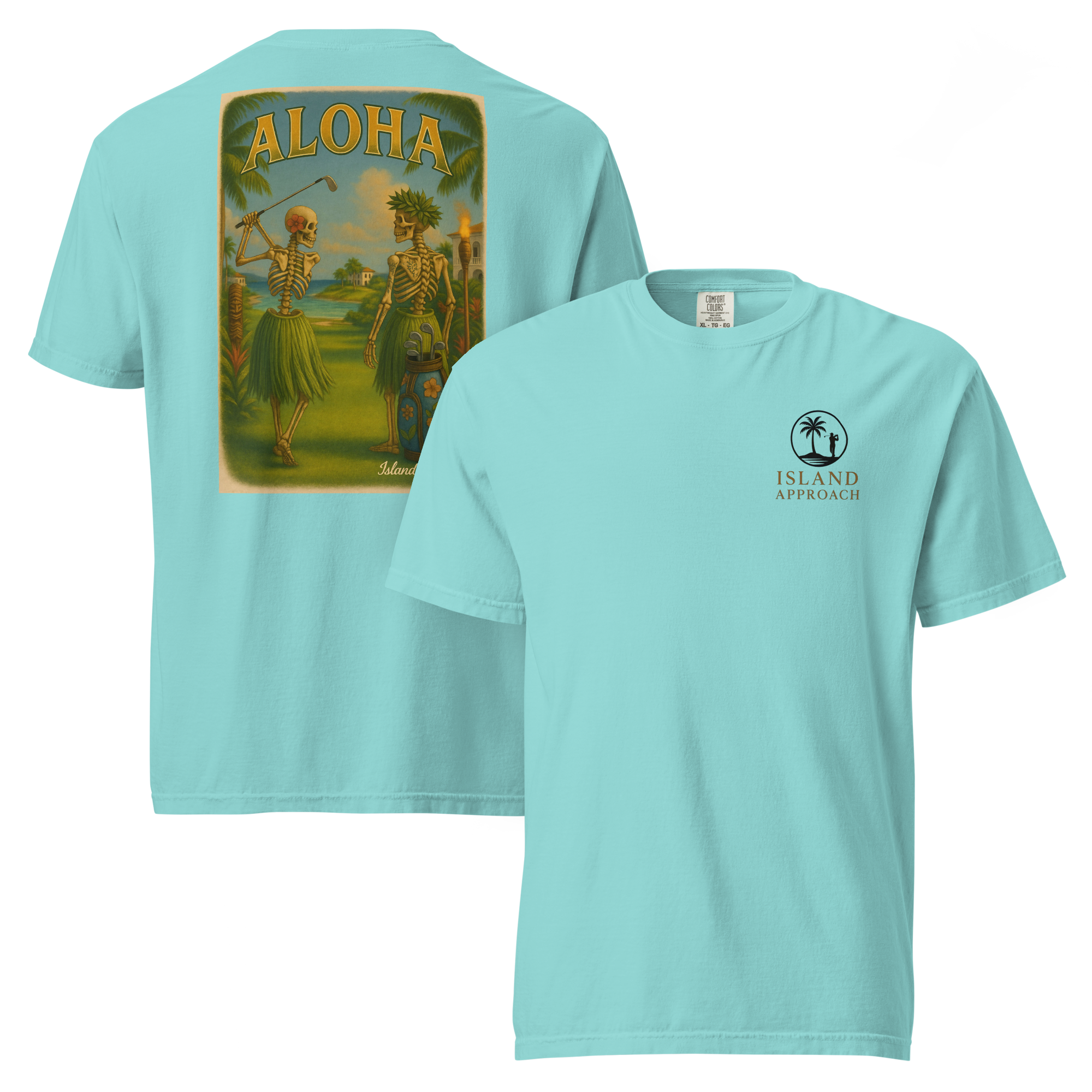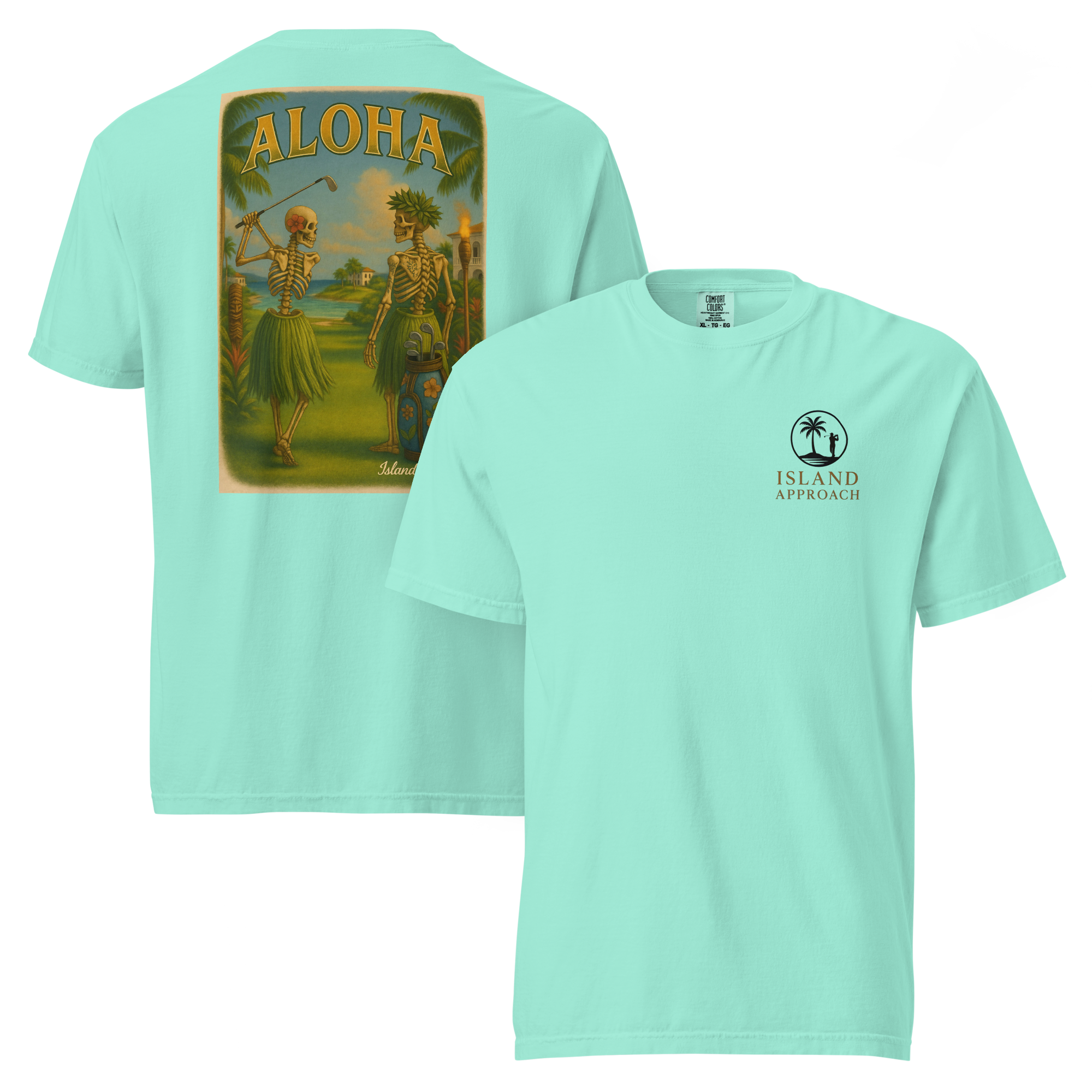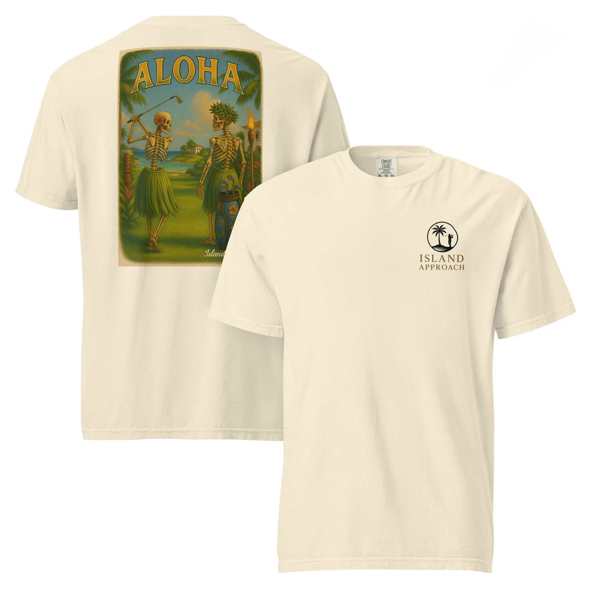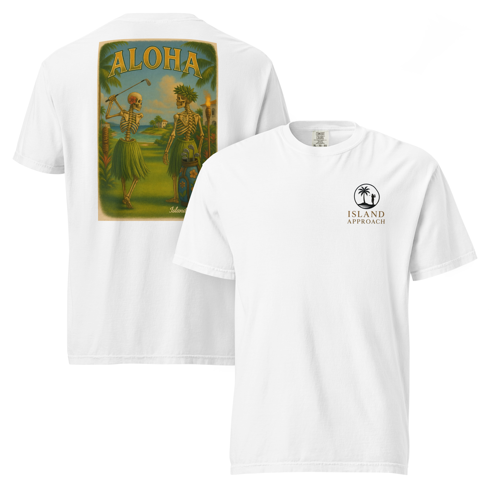 Celebrate the aloha spirit with the Aloha Tee, where tradition meets tropical golf. This unique design depicts two traditional Hawaiians reimagined as skeletons, enjoying a round of golf together in a vibrant island setting. Blending cultural pride, laid-back island vibes, and the timeless love of the game, this tee captures the essence of community, joy, and relaxation on the course.
